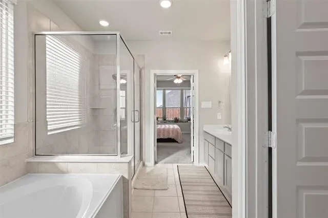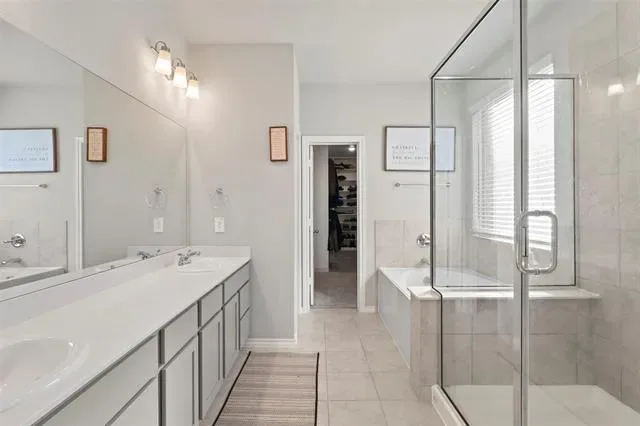 The main level features an open concept living area, private office, and an eat in kitchen with center island and granite type countertops. The first floor primary suite includes dual sinks, a separate shower, and a spacious walk in closet. A dedicated utility room with custom shelving adds practical organization. Generous living spaces throughout provide room to spread out while still feeling connected.
