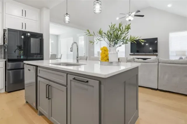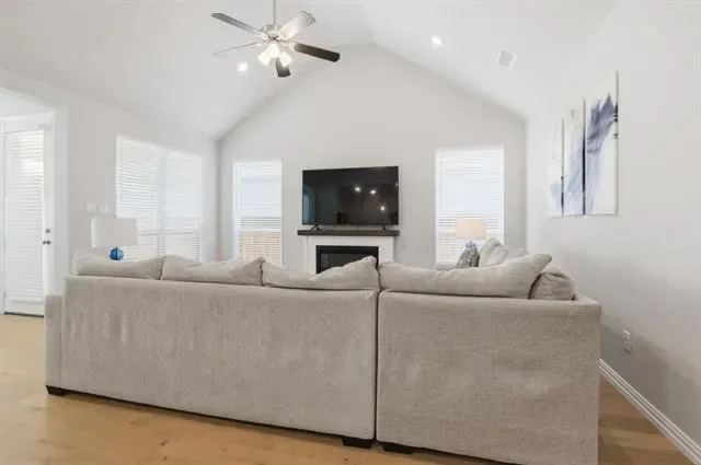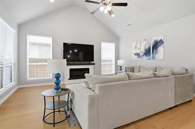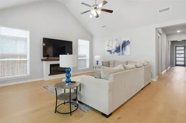 The open-concept living, kitchen, and dining space is ideal for everyday living and entertaining. Vaulted ceilings create an airy atmosphere while the modern electric fireplace anchors the living room with warmth and style. Just off the main living area, the media room offers the perfect retreat for movie nights, game days, or gaming.