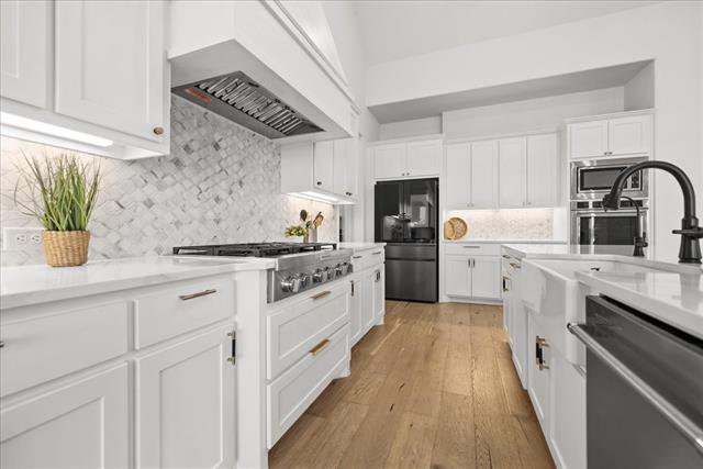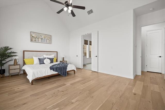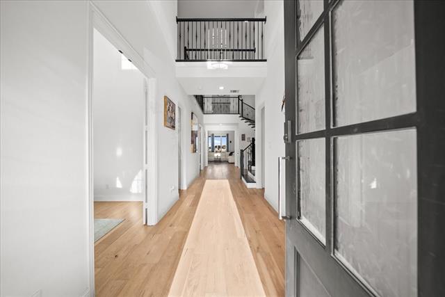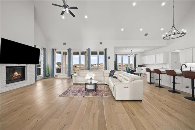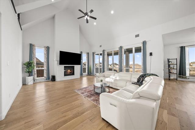 Exquisite 4,875-square-foot home showcasing transitional luxury. This 2022 American Legend residence at 2037 Waterleaf is gracefully positioned on a premium corner lot overlooking a tranquil pond, set on .41 acres. Upon entry, the home is filled with natural light, highlighted by beautiful white oak flooring throughout the main level' immediately establishing a sense of timeless sophistication. Offering 5 bedrooms, 5.5 baths, and a 3-car garage, this exceptional home is thoughtfully designed to blend refined elegance with effortless livability. Soaring vaulted ceilings and a dramatic cascade of windows create a bright and airy ambiance across the expansive open floor plan. The chef’s kitchen servesas the heart of the home' seamlessly connecting the living and dining areas. Designed for both everyday living and entertaining, it features KitchenAid appliances, an adjacent dining space, a butler’s pantry, designer lighting, and luxurious finishes throughout. The primary suite serves as a private retreat, complete with a spa-inspired bath featuring a separate soaking tub, oversized walk-in shower, and expansive his and her closets. Each secondary bedroom offers a private bath, enhancing comfort and functionality. Flexible living spaces abound' including a media room, game room, and additional bonus living area. Meticulously curated details extend from the oversized utility room to the high-end finishes throughout. With serene pond views, abundant natural light, and impeccable craftsmanship, this residence embodies elevated living in one of Haslet’s most desirable settings. Welcome home!