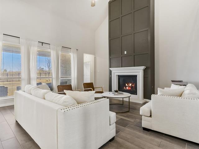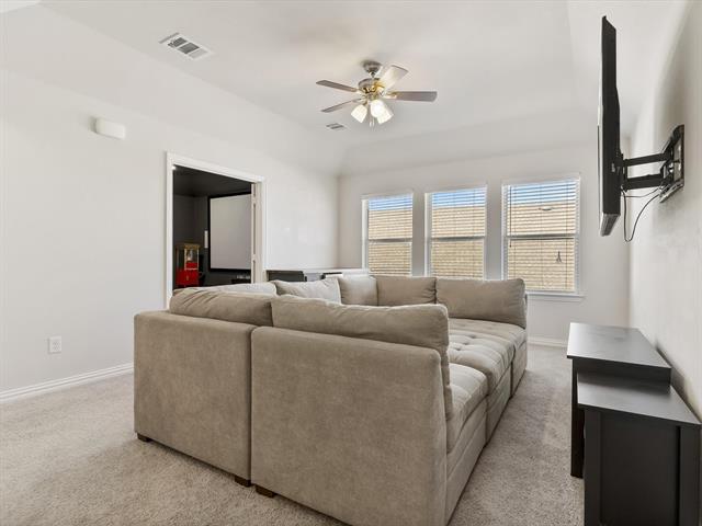 Soaring ceilings and natural light await you from the moment you step in the door. The office features beautiful French doors and a great sized closet, and could be used as a 5th bedroom! The living room is large enough for entertaining and the grand floor-to-ceiling fireplace is a beautiful centerpiece to the room! The kitchen is open and bright featuring a large breakfast bar, a wine fridge, a 5-burner gas stovetop, and large walk-in pantry with custom cabinets and countertops, perfect for tucking away those appliances! The primary bedroom is spacious with an ensuite bath featuring a separate shower and a large garden tub. The additional bedroom downstairs is great for guests! Upstairs you’ll find a large family room, a well designed media room and 2 additional bedrooms. Outback there is a great covered patio and a large yard with no houses behind! Great for privacy! This home must be seen!