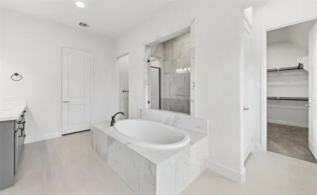 The private primary suite provides a relaxing escape with a spa-inspired ensuite bath featuring a garden tub, oversized glass-enclosed shower, dual vanities, and two walk-in closets. Two secondary bedrooms share a convenient Jack-and-Jill bath, while a fourth bedroom with its own full bath offers flexibility for guests or multigenerational living. Step outside to enjoy the covered patio and grassy backyard – perfect for outdoor dining, play, or quiet evenings. The home is complemented by beautiful landscaping and a 3-car garage for added storage and convenience.