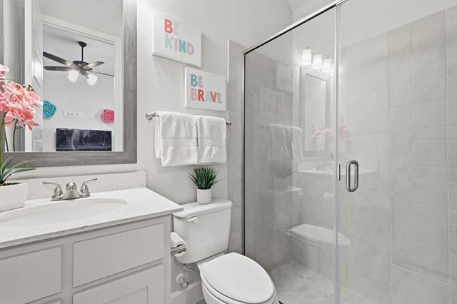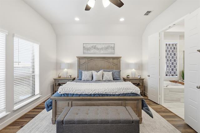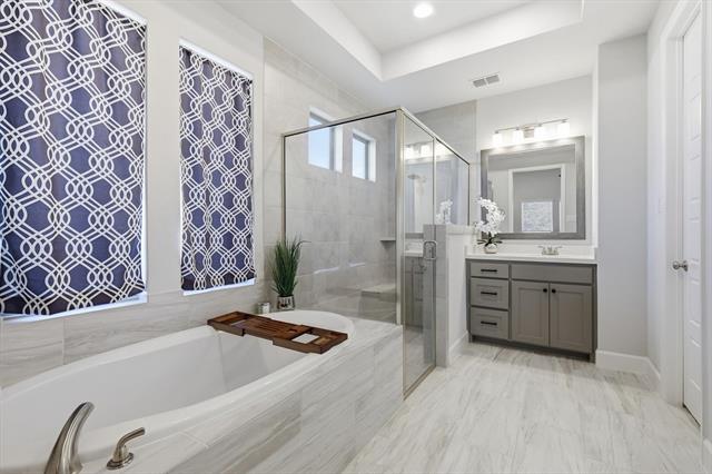 The private primary suite overlooks the backyard and includes a spa-like bath with dual vanities, framed mirrors, a soaking garden tub, separate glass-enclosed shower with upgraded tile to the ceiling, stainless fixtures, and a large walk-in closet. A separate guest suite with full bath provides ideal privacy for visitors or multi-generational living.