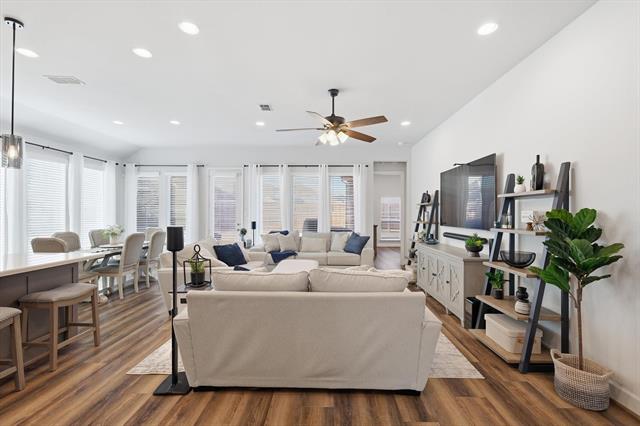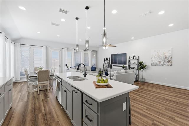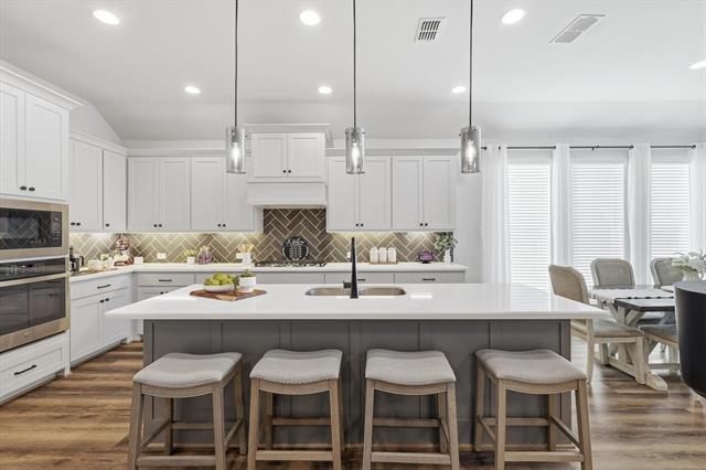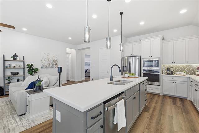 The gourmet kitchen is a standout, showcasing an oversized island with seating, upgraded engineered stone countertops, waterfall island edge, built-in stainless appliances, gas cooktop, under-cabinet LED lighting, walk-in pantry, and abundant cabinetry with soft-close drawers. Luxury vinyl plank flooring flows through the main living areas, creating a clean, modern look with durability for everyday living.