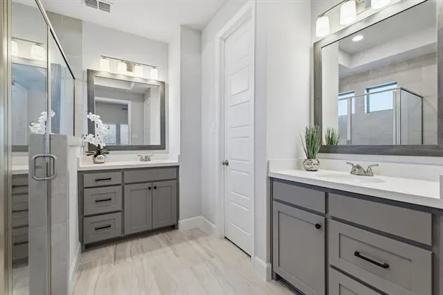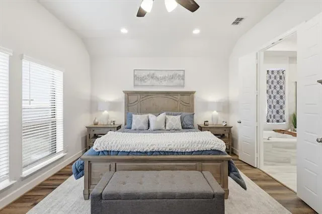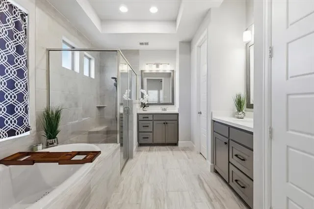 The private primary suite overlooks the backyard and includes a spa-like bath with dual vanities, framed mirrors, a soaking garden tub, separate glass-enclosed shower with upgraded tile to the ceiling, stainless fixtures, and a large walk-in closet. A separate guest suite with full bath provides ideal privacy for visitors or multi-generational living.