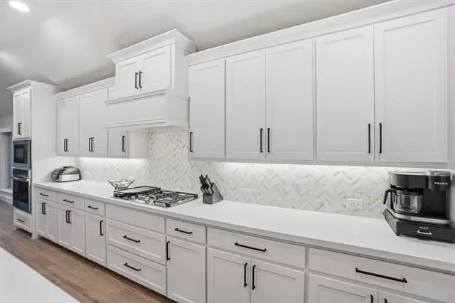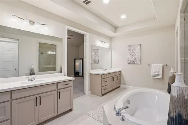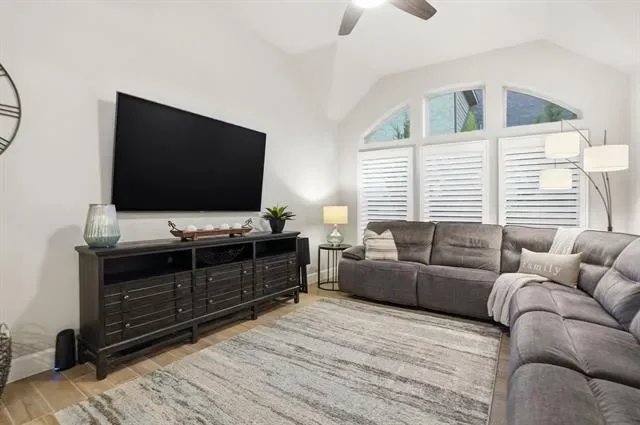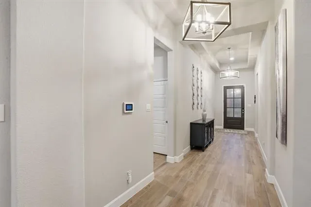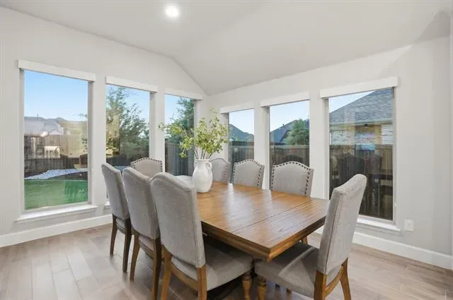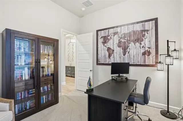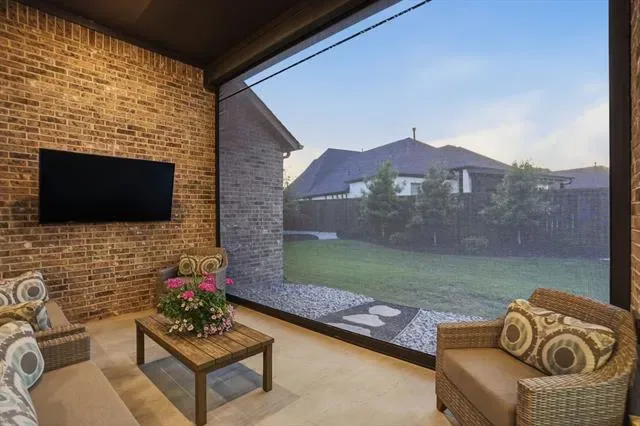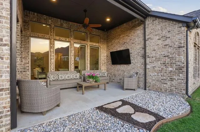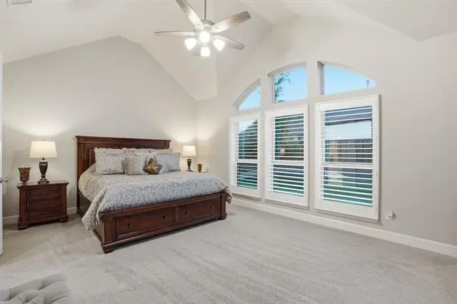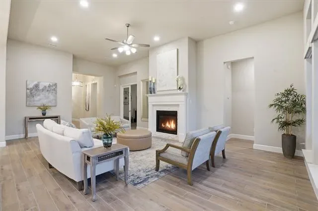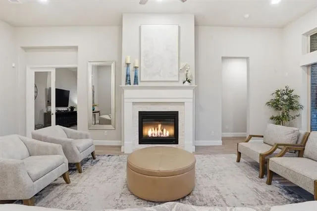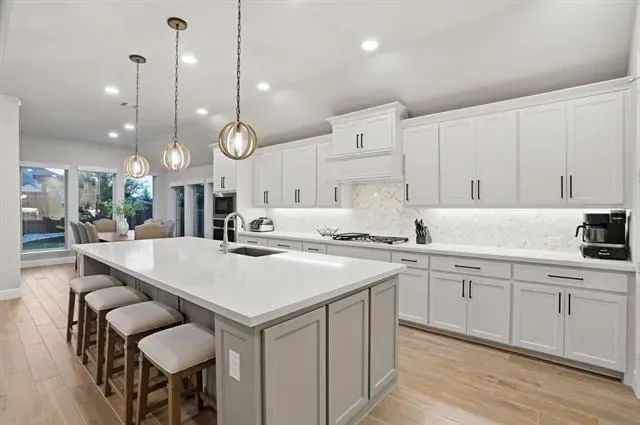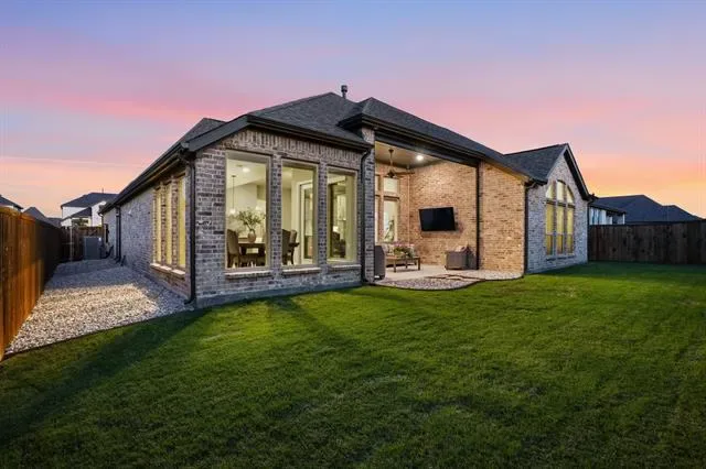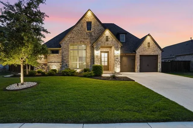 Built by Perry Homes and designed for elevated living, this one-story home in the prestigious Watercress neighborhood offers 2994 square feet of thoughtfully-crafted living space featuring four bedrooms with study option, three full bathrooms, a chef’s kitchen with dining area, an oversized living area, a private game-media room with French doors, a MUD-utility area and a tandem three-car garage. Clean architectural lines, a plethora of upgrades, and modern finishes define the home’s sophisticated style. The chef’s kitchen anchors the home with lovely quartz counters, Herringbone backsplash, an expansive center island, top-of-the-line GE appliances including a five-burner gas cook-top, upgraded cabinetry and an elegant dining area surrounded by windows. Open to the kitchen, the oversized family room boasts a raised ceiling, a wall of windows, and a stately stacked stone fireplace. The backyard patio presents an upgraded remote-controlled outdoor screen dissolving boundaries between inside and out. Plantation shutters, custom shades, wood-inspired tile flooring, modern fixtures and upgraded hardware elevate the home with timeless sophistication. A thoughtfully designed flex room with French doors adds versatility to the floor plan. Seamlessly adapting to one’s lifestyle, this room could be used for entertainment, work, wellness, or creative pursuits. The three-car, tandem garage ensures both function and ease of living. Additional amenities include automatic shades, plantation shutters, custom landscape, professional up-down lighting, tankless water heater, an upgraded breaker box with surge protection, Radiant Barrier insulation and more. Watercress residents enjoy exclusive access to a resort-style pool, covered pavilion with fireplace, sink and grills, playground and stocked ponds for fishing. This home feeds the award-winning Northwest ISD and is located just a short commute to downtown Fort Worth and the upscale shopping and restaurants at Alliance Town Center.