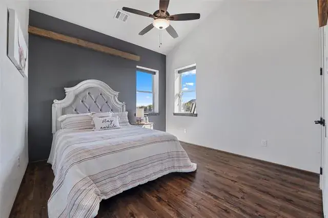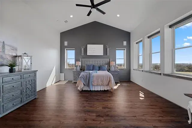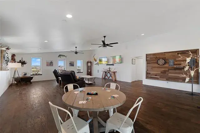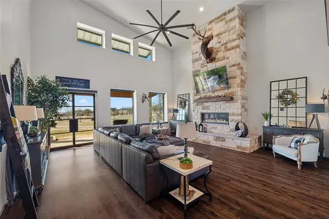 Built in 2019, this custom home sits on 4 wide-open acres and delivers space, privacy, and features you don’t see every day. Five bedrooms are located on the main floor, with a large game room upstairs—ideal for movie nights, kids, or guests. The kitchen was updated in 2024 and is built to perform, featuring quartz countertops, a 6-burner gas cooktop with griddle, built-in refrigerator, walk-in pantry, and a dedicated wine bar. The open living area is highlighted by soaring 20-foot ceilings, creating a bright, expansive feel.