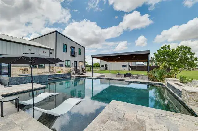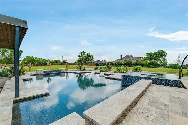 The primary suite is a true retreat with a coffee bar, spa-style rain shower, and an oversized custom closet. Step outside and the property really shines. The backyard is designed for entertaining with a resort-style pool, spa, swim-up bar, fire features, and travertine decking throughout. A gas fire pit sits near the home and pool, while a separate wood-burning fire pit is tucked farther back—perfect for quiet nights under the stars. The covered outdoor living space includes a built-in grill, making it easy to host year-round.
