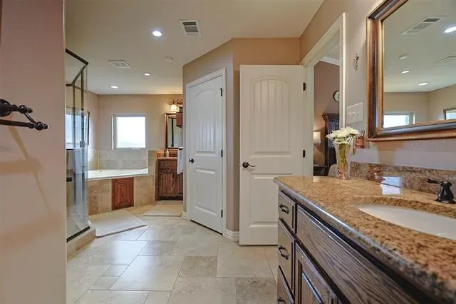 The main house is 4 bedrooms, 2.5 bathrooms, and 2 fireplaces. The kitchen has an oversized island, double ovens, walk-in pantry, and dual sinks. The primary bedroom on the first floor, includes a fireplace, jetted tub, double vanities, separate shower, and custom closet system. The second floor bedrooms are spacious, with built in features and the fourth bedroom features a walk out balcony for those amazing Texas sunsets.