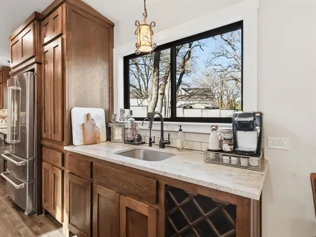 The kitchen is beautifully designed with white oak stained cabinetry, quartzite countertops, soft-close drawers, under-cabinet lighting, and a built-in pantry. A second prep sink and bar area with a built-in wine rack adds a perfect space for entertaining, along with a filtered drinking water faucet for everyday convenience.