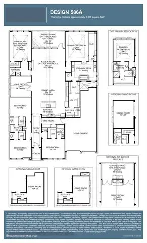 Extended entry leads to open kitchen, dining area and family room. Kitchen features walk-in pantry, double wall oven, a wet bar, Butler’s pantry and island with built-in seating space. Dining area flows into family room with wall of windows and a wood mantel fireplace. Hardwood floors throughout main living area. Game room with wall of windows just off family room. Primary suite includes bedroom with wall of windows. Primary bath includes dual vanities, a freestanding tub, elongated separate shower and two walk-in closets, one with access to utility room. Guest suite offers private bath. A Hollywood bath adjoins second and third bedroom. Soaring ceilings and abundant closet space add to this generous four-bedroom design. Covered backyard patio. Mud room leads to three-car garage.