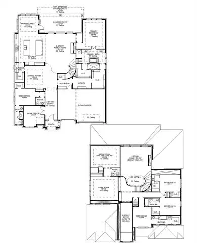 Step off the front porch into a grand entryway embraced by a two-story ceiling. A secluded home office is right off the front door and features French doors and a view of the front yard. A guest suite with a full bathroom and walk-in closet is down the hall. As you pass the dining room you enter the main living areas. The curved staircase embraces the two-story family room which boasts a fireplace and walls of windows. The kitchen offers a prep island, an additional island with built-in seating, a butler’s pantry, and oversized walk-in pantry. The corner morning area is embraced by two walls of windows and provides access to the backyard covered patio. The primary bedroom is off the family room and features a tall tray ceiling and wall of windows. Double doors lead into the primary bathroom with dual vanities, a freestanding tub, linen closet, and two walk-in closets. It also provides dual access to the utility room for added convenience. Upstairs you are greeted by a large game room with ample natural light. A media room connects to the space and allows for additional entertainment. The three secondary bedrooms upstairs all feature their own full bathrooms and walk-in closets. The mud room and utility room are off of the three-car garage.