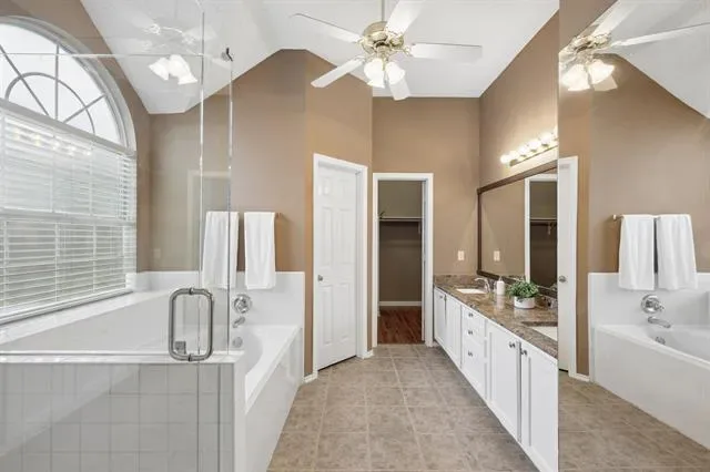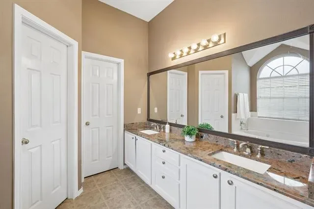 Oversized primary bedroom is at the back of the house and can easily fit king-sized furniture. Ensuite bath features his and her sinks, separate tub &' shower, and large walk-in closet.