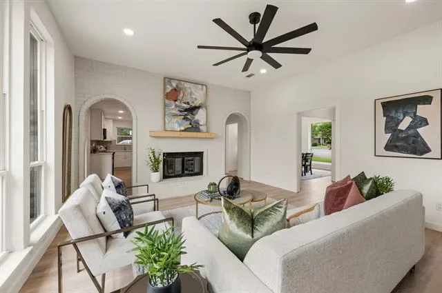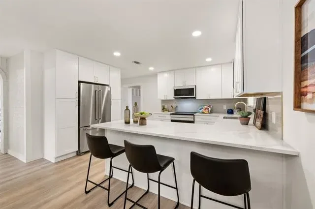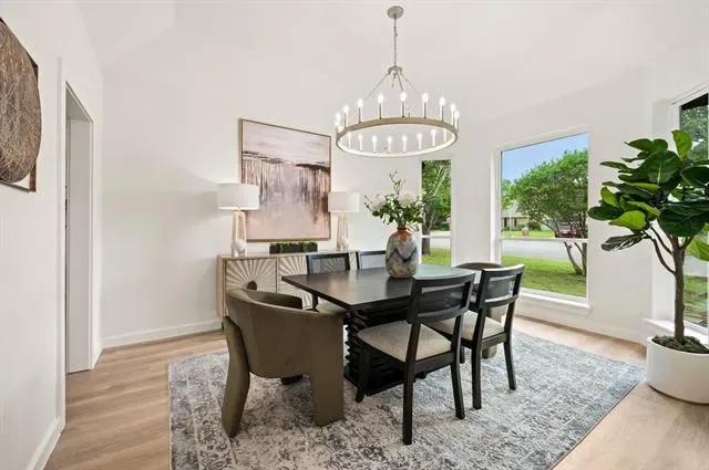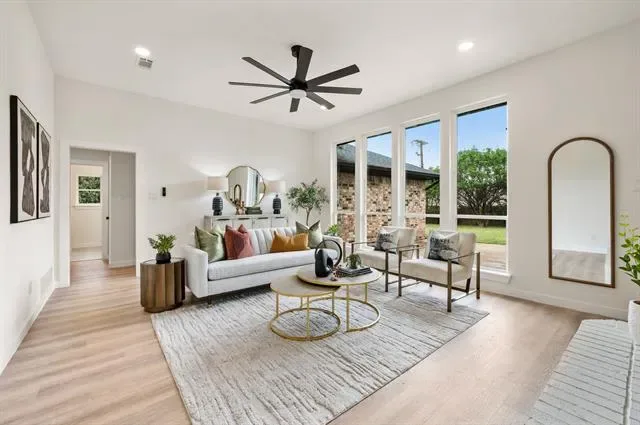 Fully renovated GEM on a spacious corner lot in an amazing mature and convenient north Hurst area in the award-winning Birdville ISD! Grand entry with high ceilings throughout, large living with nearly floor-to-ceiling windows; chef’s kitchen with expanded pantry space, new Samsung Bespoke appliances, and Calacatta Luxe quartz countertops. Master retreat featuring tray ceiling, designer master shower, freestanding bathtub, his and hers closets, and private washroom. On the other side of the home is a flex space- add in closet or armoire for a fourth bedroom, office, exercise room, or free space for any hobbyist! Top to bottom thoughtful renovations with brand new roof, new vinyl windows, new flooring and trim, 100% wood soft close cabinetry, added mud bench and laundry sink, epoxy garage flooring, and so much more!