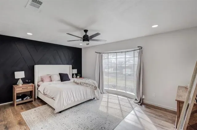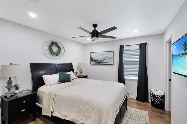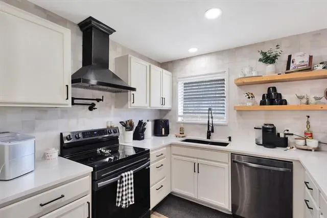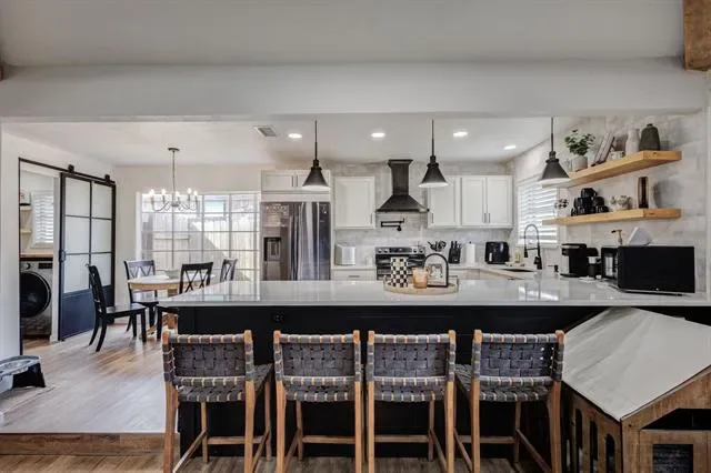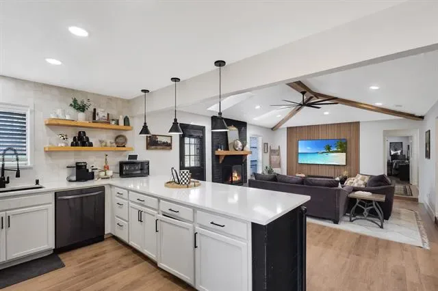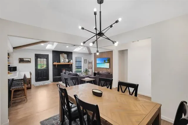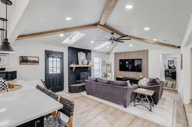 Updated 4 bedroom, 2 bath home featuring an open-concept layout with vaulted ceilings and wood beam accents. The remodeled kitchen includes stainless steel appliances, subway tile backsplash, and a large island with seating, perfect for entertaining. Property offers updated flooring and a stylish accent walls. Additional bedrooms provide flexibility for family or a home office. New roof installed January 2026. The spacious backyard is great for entertaining and offers the perfect opportunity to make it your own (photo includes digitally added artificial grass for staging purposes).