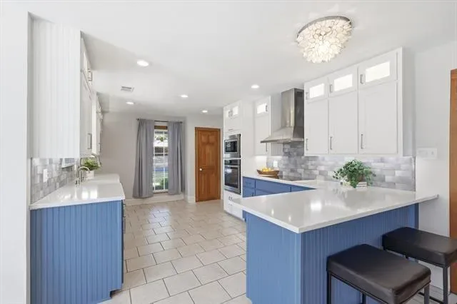 Inside, the living room makes a stunning first impression with soaring cathedral ceilings, expansive windows, and a striking brick fireplace as the focal point. The updated kitchen blends style and function with a ribbed front farmhouse sink, induction cooktop, under cabinet lighting, and