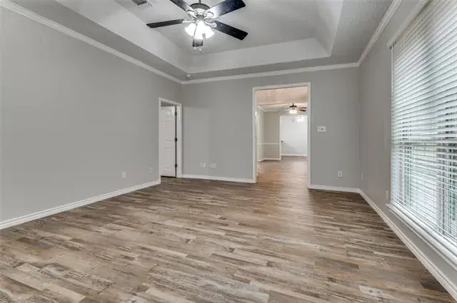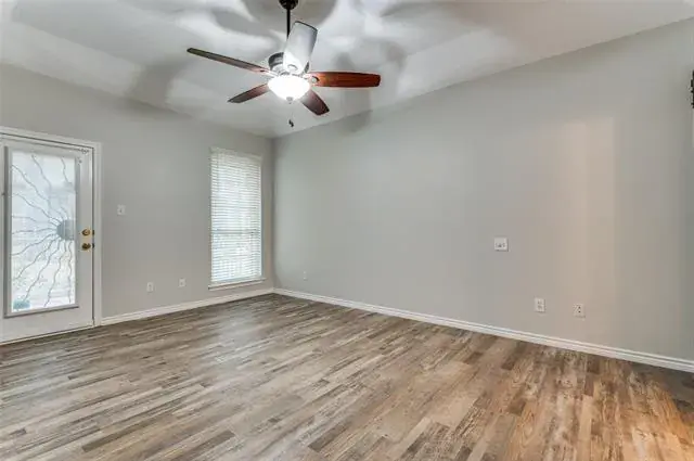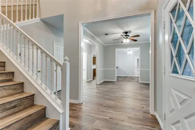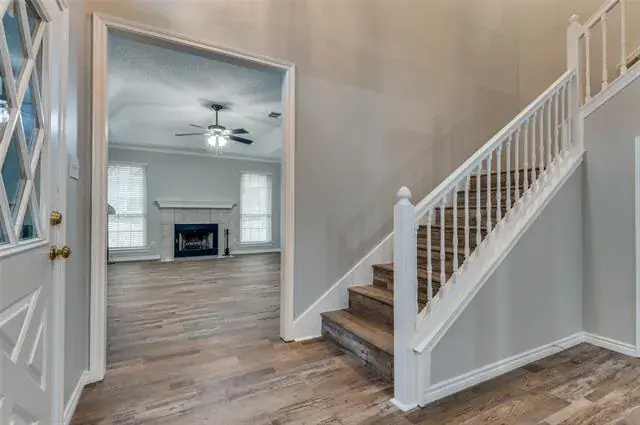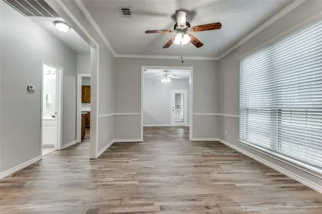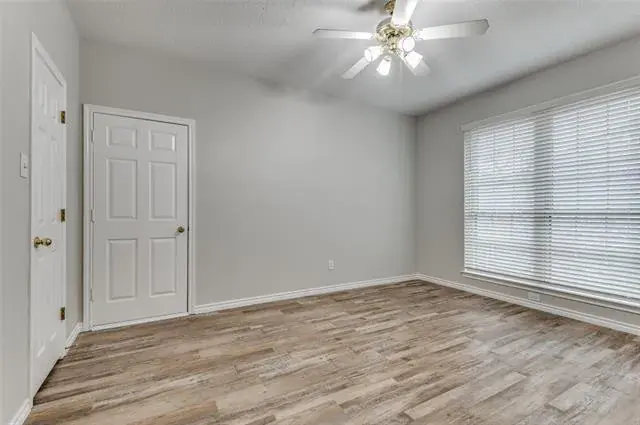 Move-in ready 3-bedroom. 2.5 bath & Bonus Room floorplan. Primary Bedroom is a first level personal retreat with its own patio. Primary Bath totally remodeled in 2023 with a sleek, modern appearance with dual sinks, quartz counters, walk-in shower and massive linen closet. Upstairs is a Full Bath, two generously sized bedrooms and Bonus Room allows everyone to spread out. The home has plentiful storage with 5 walk-in closets and 2 walk-out attics (see floorplan in photos). The Kitchen has abundant cabinets, a generous walk-in pantry and breakfast bar. Laundry Room exits to the versatile 2-car garage with an extra workshop space & sink. Freshly painted interior walls, trim, doors and ceilings. LVP flooring installed throughout the home December 2024. Low-e double hung windows allow opening from top & bottom. All new window blinds. Roof replaced December 2024. Water heater and food disposal recently replaced as well. New downstairs Heat Pump HVAC unit with 10 year warranty (seller will pay for transfer fee) installed January 2026. there are 2 patios, one covered. one fenced facing South to the courtyard. Most exterior maintenance and lawn care included with HOA, plus the use of the community pool, spa and clubhouse. Great location, near NorthEast Mall, plenty of nearby shopping, restaurants, churches and schools. Quick trip to all areas of the MetroPlex and DFW Airport too.