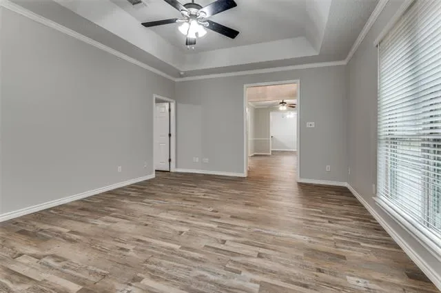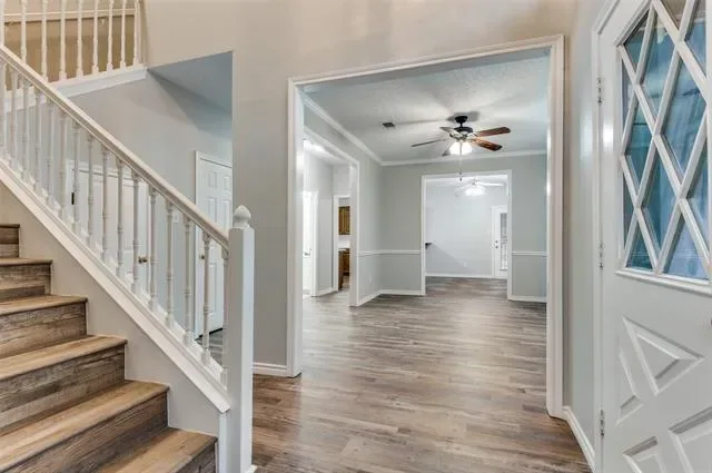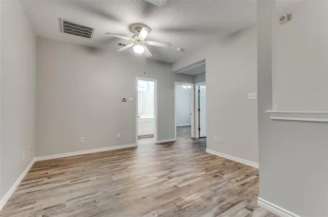 Move-in ready 3-bedroom. 2.5 bath & Bonus Room floorplan. Primary Bedroom is a first level personal retreat with its own patio. Primary Bath totally remodeled in 2023 with a sleek, modern appearance with dual sinks, quartz counters, walk-in shower and massive linen closet. Upstairs is a Full Bath, two generously sized bedrooms and Bonus Room allows everyone to spread out. The home has plentiful storage with 5 walk-in closets and 2 walk-out attics (see floorplan in photos). The Kitchen has abundant cabinets, a generous walk-in pantry and breakfast bar. Laundry Room exits to the versatile 2-car garage with an extra workshop space & sink. Freshly painted interior walls, trim, doors and ceilings. LVP flooring installed throughout the home December 2024. Low-e double hung windows allow opening from top & bottom. All new window blinds. Roof replaced December 2024. Both water heaters and food disposal recently replaced as well. New downstairs Heat Pump HVAC units with 10 year warranty (seller will pay for transfer fee) installed January 2026 and upstairs units will be replaced April 2026. there are 2 patios, one covered. one fenced facing South to the courtyard. Most exterior maintenance and lawn care included with HOA, plus the use of the community pool, spa and clubhouse. Great location, near NorthEast Mall, plenty of nearby shopping, restaurants, churches and schools. Quick trip to all areas of the MetroPlex and DFW Airport too.