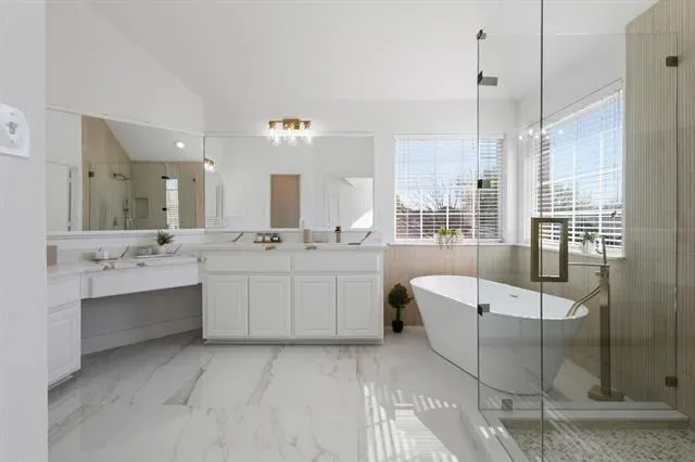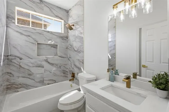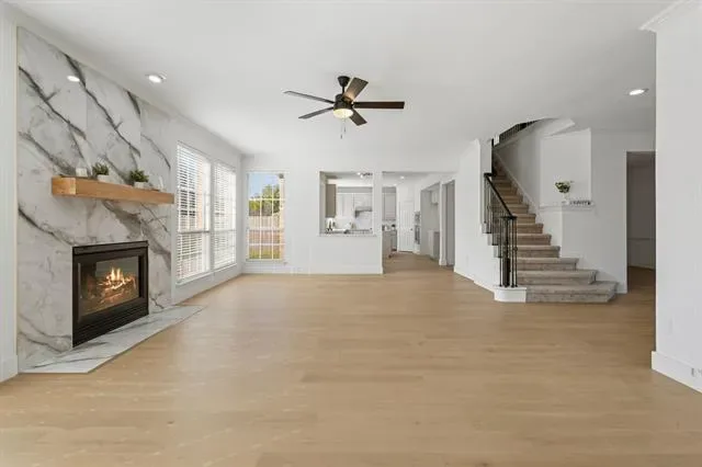 This home features a bright, open-concept layout with engineer wood flooring, designer finishes, and abundant natural light throughout. The spacious living area is highlighted by a stunning floor-to-ceiling tiled fireplace, creating a perfect focal point for entertaining. The fully remodeled kitchen offers quartz countertops, a stylish backsplash, and a large island that opens seamlessly to the main living and dining areas. The primary suite includes a spa-like bathroom with a freestanding soaking tub, frameless glass shower, and modern finishes. All bathrooms have been tastefully updated with clean, timeless design. Enjoy a dedicated media room perfect for movie nights or entertaining. The downstairs guest bedroom is a versatile room that can be used as a home office or additional bedroom. Located in Keller ISD with easy access to shopping, dining, and major highways. Nicely updated and truly move-in ready—this home offers a great blend of style, comfort, and location!