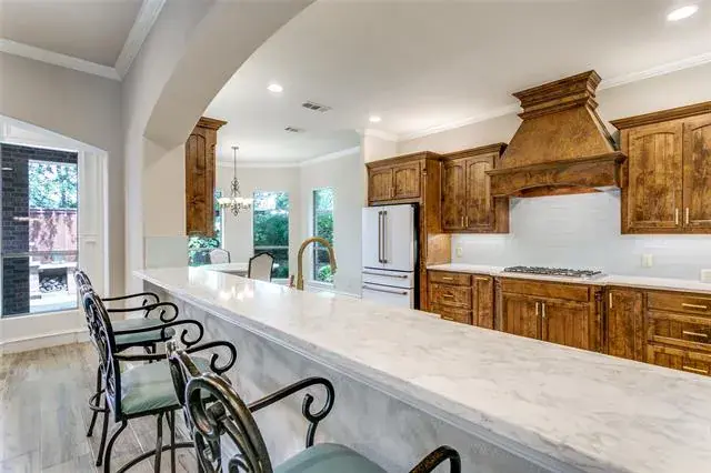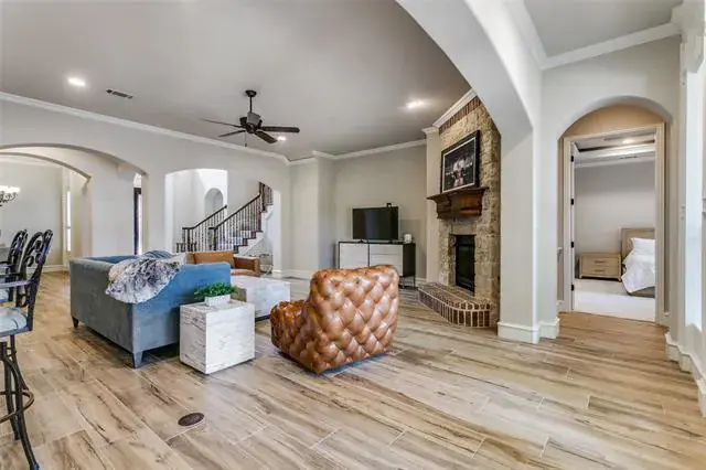 Charming two-story custom home with lots of extra detail and a cozy cottage feel in Bella Vista. 3,809 sq. ft., 4 Bedrooms, 3.5 Baths. Downstairs remodeled with new flooring, high end quartz countertops, top quality sinks and faucets, kitchen backsplash, new master shower and faucet, freestanding master tub and faucet, and brand new GE Cafe White appliances. Viking gas cooktop. Study has hardwood floor and French doors. Wrought iron front door and stairway railing. Gas log fireplace. 10 foot ceilings, 8 foot interior doors, and arched entryways. Plantation shutters. Great storage space including walk-in closets and large pantry. Low maintenance corner lot. Flagstone patio. Conveniently located to numerous businesses, stores, and restaurants. Less than one mile from popular Bear Creek Park, the Keller Pointe, dog park, and Keller City Hall. In highly sought after Keller school district. This open concept gem surrounded by trees is well maintained and ready for move in.