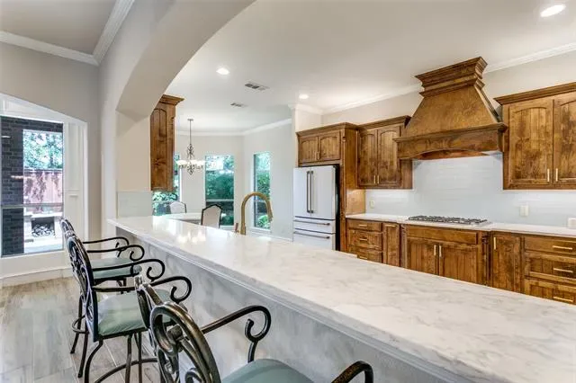 Charming two-story custom home with lots of extra detail and a cozy cottage feel in Bella Vista. 3,809 sq. ft., 4 Bedrooms, 3.5 Baths. Downstairs remodeled with new flooring, high end quartz countertops, top quality sinks and faucets, kitchen backsplash, new master shower and faucet, freestanding master tub and faucet, and brand new GE Cafe White appliances. Viking gas cooktop. Study has hardwood floor and French doors. Wrought iron front door and stairway railing. Gas log fireplace. 10 foot ceilings, 8 foot interior doors, and arched entryways. Plantation shutters. Great storage space including walk-in closets and large pantry. Low maintenance corner lot. Flagstone patio. Conveniently located to numerous businesses, stores, and restaurants. Less than one mile from popular Bear Creek Park, the Keller Pointe, dog park, and Keller City Hall. In highly sought after Keller school district. This open concept gem surrounded by trees is well maintained and ready for move in.