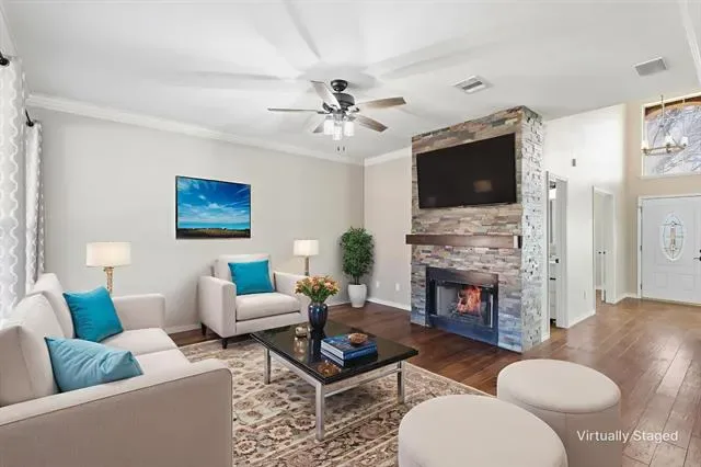 As you enter in the primary there is a nice sized private living space! It is a private retreat with a spacious bedroom and an ensuite bath offering a soaking tub, separate shower, dual vanities, and a large walk-in closet. Plus a personal fireplace! Three additional bedrooms share a well-appointed bath, providing comfortable accommodations for family or guests.