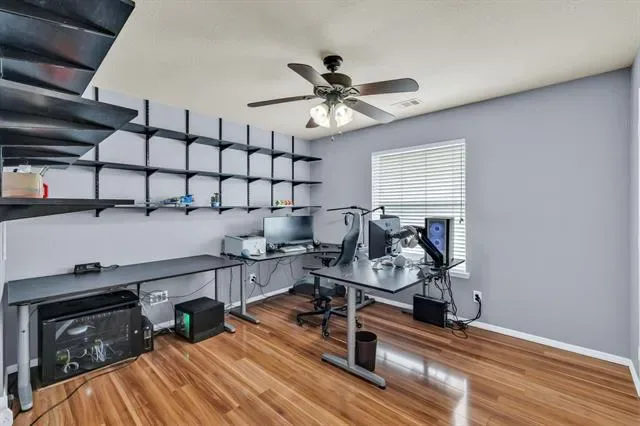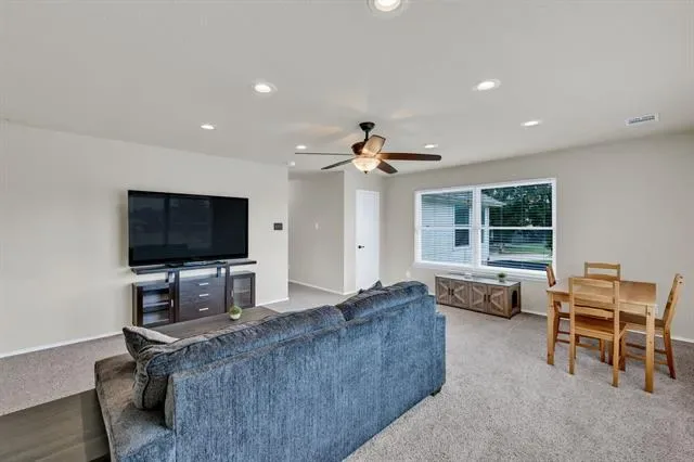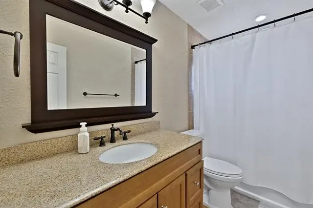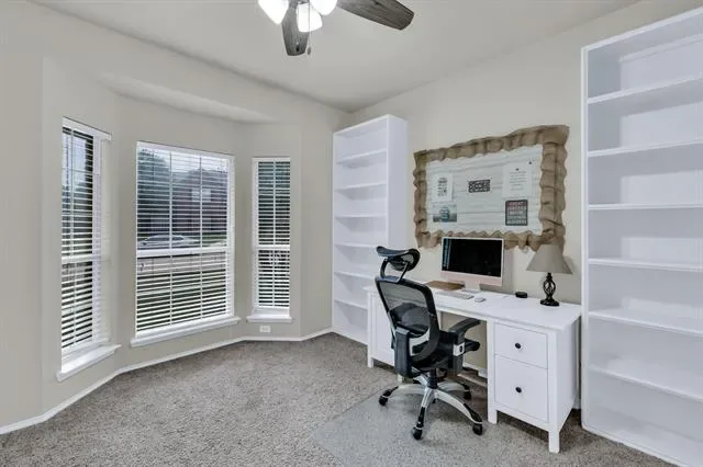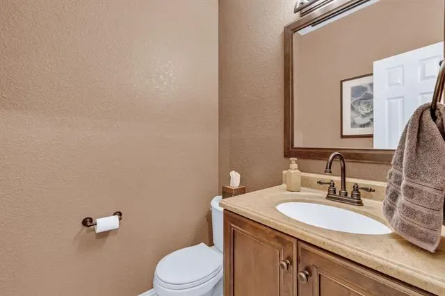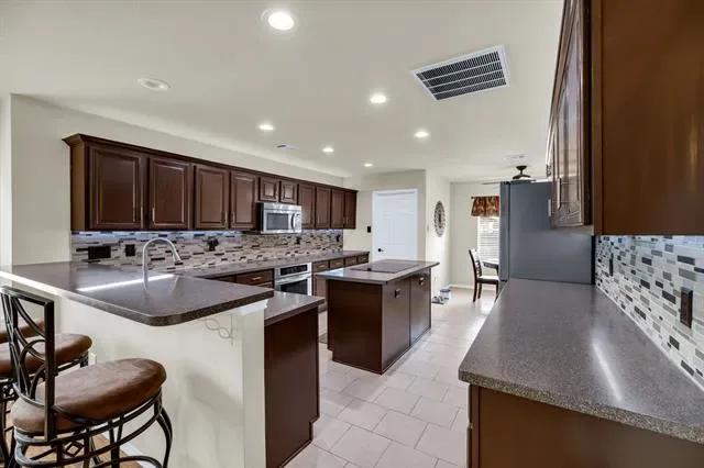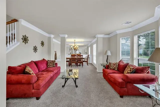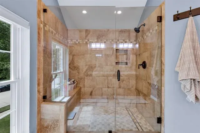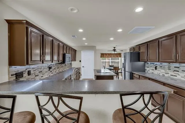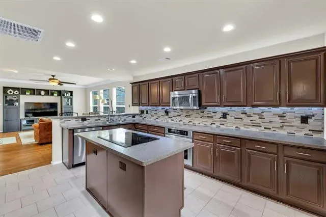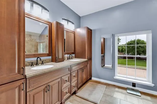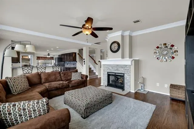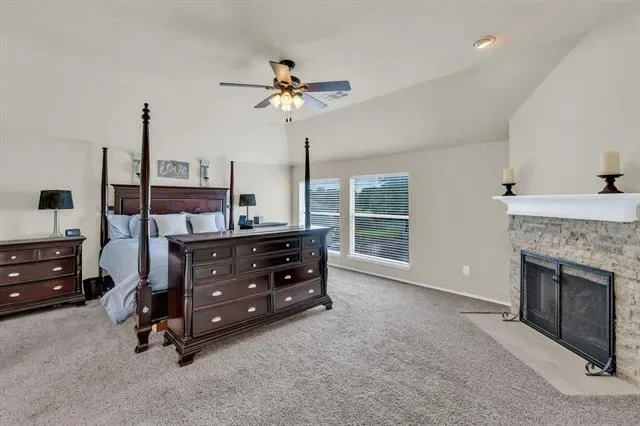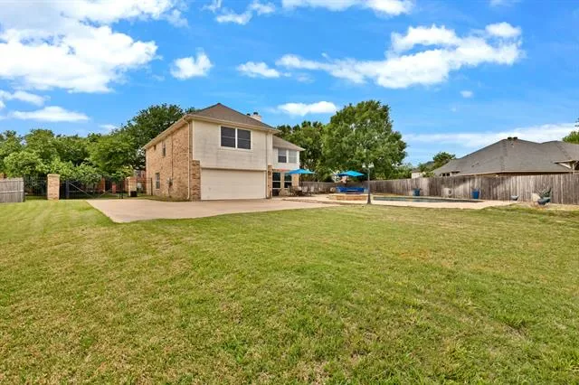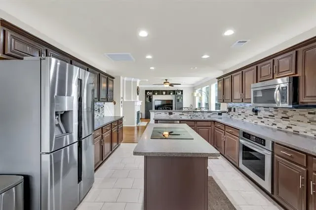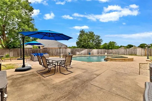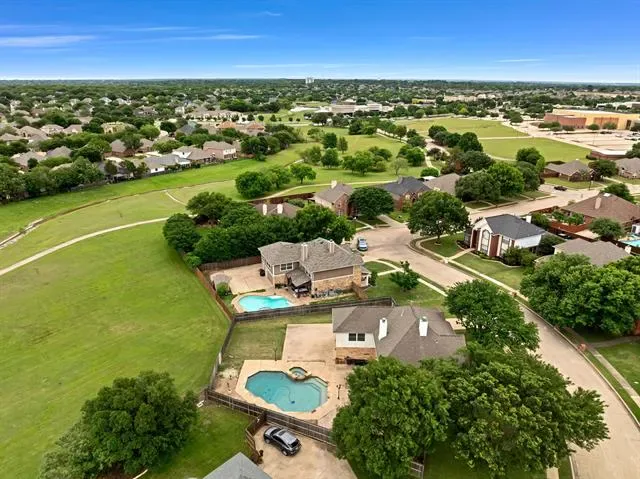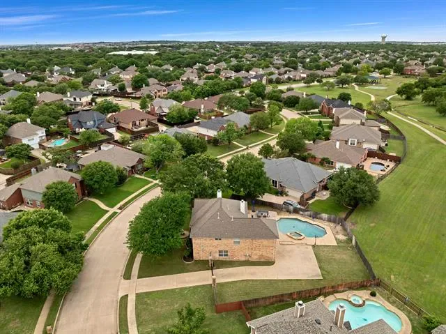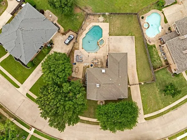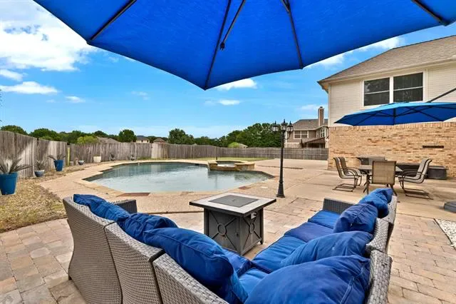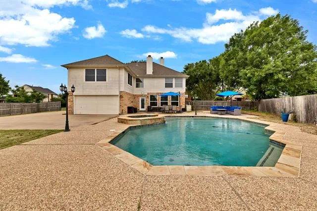 Updated home backing to the greenbelt with a gated driveway and resort-style backyard featuring an updated pool, separate concrete pad, and tiled seating area perfect for entertaining. Remodeled kitchen includes recessed lighting, new floor tile, updated backsplash, updated oven and cooktop, and a bright walk-in pantry. Spacious primary suite offers an updated gas fireplace and sitting area, while the spa-like primary bath features a large shower and abundant recessed lighting. Large media room overlooks the pool and greenbelt and includes updated windows and recessed lighting. Family room features an updated gas fireplace and beautiful pool views. Additional updates include Class 4 hail-resistant roof (2015), upstairs HVAC (2017), downstairs HVAC (2024), fresh front sod (2024), rebuilt chimneys (late 2025), updated ceiling fans, and built-in lighted garage storage