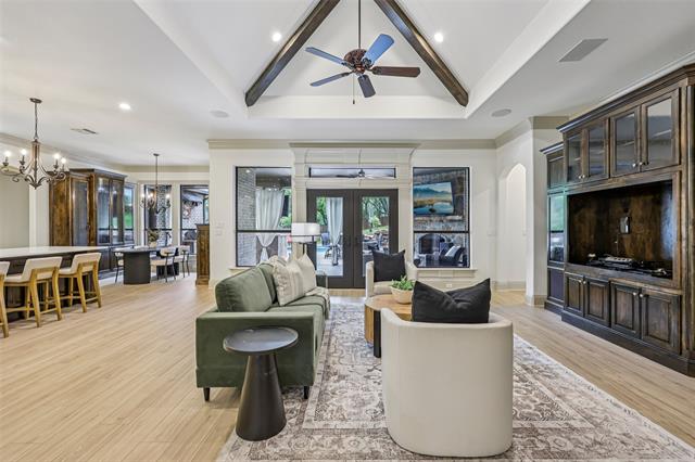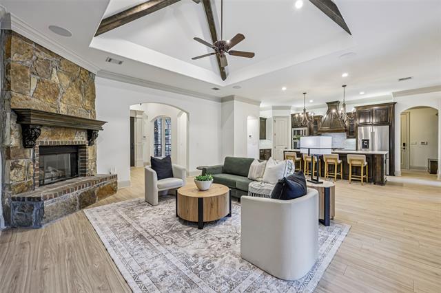 Nestled on just over an acre, this stunning estate offers the perfect blend of luxury, comfort, and privacy. Showcasing beautiful brick and stone curb appeal, a charming wrap-around front porch, and a side-entry 3-car garage, the home makes a lasting first impression. Inside, you’ll find a thoughtfully designed layout featuring 4 bedrooms on the main level, a formal dining room ideal for entertaining, and a dedicated executive study with built-ins. The spacious family room is anchored by a striking stone fireplace and flows seamlessly into the chef’s kitchen, complete with a large seated island, double ovens, 6 burner gas cooktop, and refinished cabinetry—perfect for everyday living and hosting alike. The primary suite is a true retreat, offering a cozy sitting area and a relaxing ensuite with dual vanities, jetted tub, walk-in shower, and a generous walk-in closet. Upstairs, enjoy endless entertainment in the game room and media room with tiered floor. Freshly painted interiors and new wood floors add a bright, updated feel throughout. Step outside to your private backyard paradise, where a covered patio with fireplace, outdoor kitchen with bar seating, and a sparkling pool are surrounded by lush green space and mature shade trees—ideal for relaxing or gathering with friends and family. Perfectly positioned near Westlake’s prestigious financial district, the exclusive Vaquero Club, and just minutes from Southlake Town Square, this exceptional property offers luxury living in a prime location.