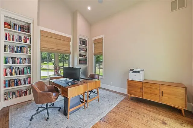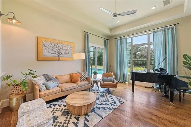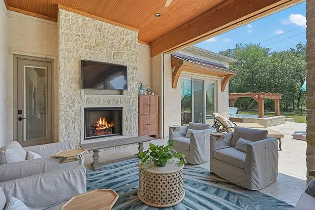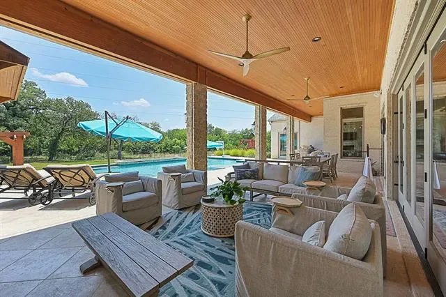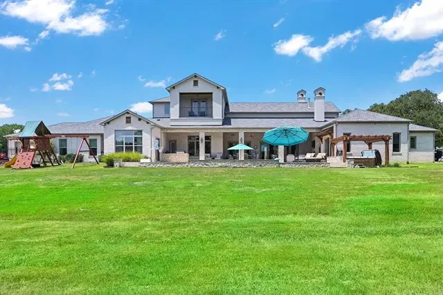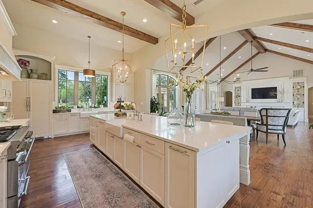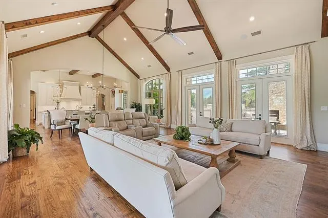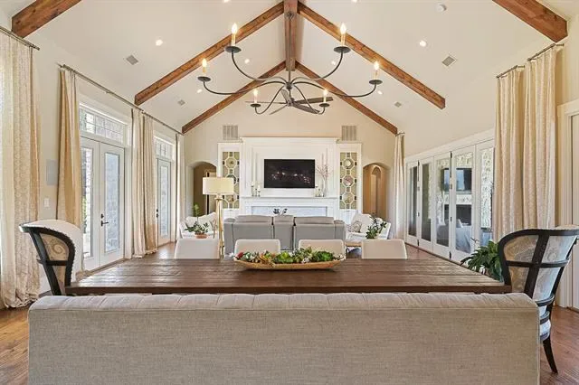 Stunning multigenerational estate on 6.29 private acres blends luxury craftsmanship with resort-style living. The open-concept main hall seamlessly connects the kitchen, living, dining, and breakfast areas. This fully equipped dream kitchen includes Thermador appliances, dual farmhouse sinks, dual dishwashers, and built-in Miele coffee system. The main residence features 4 bedrooms with ensuite baths, including a spacious primary suite with separate his-and-hers closets, laundry, folding station, and vanity. Just off the foyer, a serene study with cathedral ceiling opens to its own paver courtyard with cafe lighting. Designed for exceptional indoor-outdoor entertaining, this home features a front paver courtyard with fireplace, front and rear balconies, a large covered patio equipped with drop screens, accordion style glass doors, an outdoor kitchen, and multiple fire features. The main level game-media room offers direct pool and patio access and includes a wet bar and beverage station, while the heated pool and spa complete the unmatched outdoor living experience. Interior finishes include expansive kitchen island, solid 8” white oak hand scraped hardwood flooring throughout main areas, and tile in wet areas. Additional highlights include whole-home audio, LED lighting throughout, hard-wired security cameras, water purification system, and four tankless water heaters. The guest house main level includes living area, full kitchen, full bath, while the second level features a spacious bedroom with laundry—ideal for extended stays or multigenerational living. The property includes two ponds with a water feature in front, a well-fed irrigation system, and a mix of cleared and wooded land. Car collectors will appreciate the 6 garage bays with climate control and one pass-through door.
