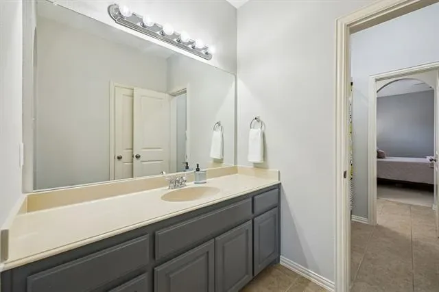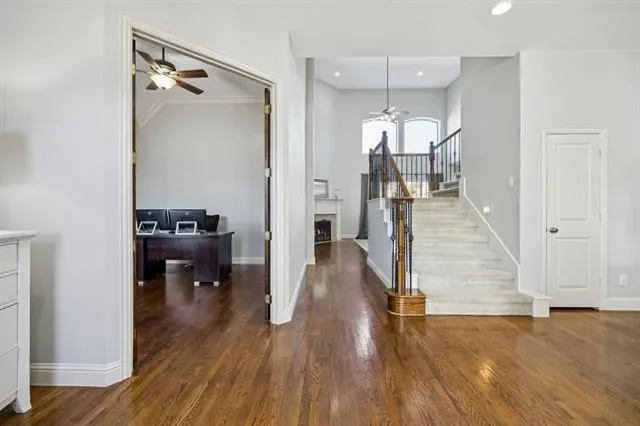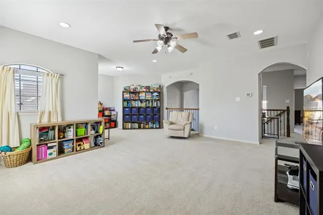 Updated Keller home offering 3,888 square feet with four bedrooms and three and one-half baths. Hardwood flooring was added through the main living areas creating seamless flow from the formal dining room and private office into the central living space. Neutral finishes complement any style. The interior has been repainted in light gray with Divine white trim providing a neutral backdrop. Open living room with fireplace and tall windows connects to the breakfast area and kitchen. Kitchen features granite countertops, oak cabinetry, large island with storage, abundant cabinets, and an expansive walk-in pantry. Breakfast bar and adjoining nook overlook the backyard patio. Primary suite on a separate wing offers a spacious bedroom, large walk-in closet, and bath with dual sinks, jetted tub, separate shower, and private water closet. Second downstairs suite includes a private ensuite bath. Upstairs, two bedrooms share a Jack and Jill bath. Second level includes a loft or flex room and a dedicated media room prewired for sound. Large toy room adaptable to hobbies or exercise. Balcony overlooking the main living room adds architectural interest. Formal dining near the entry can serve as flex space, and the private office supports working from home. Laundry room includes built-in cabinets and closets are generous throughout. Walk-in closets provide excellent storage options. Backyard patio and welcoming front patio provide outdoor enjoyment. Mature landscaping frames the yard. Layout feels connected while offering distinct private areas. Fireplace creates a cozy focal point. Located in a quiet neighborhood close to Old Town Keller with easy access to restaurants, shopping, everyday services, and a Target about five minutes away. Built in 2007, the residence blends modern updates with timeless design and is served by highly regarded schools.