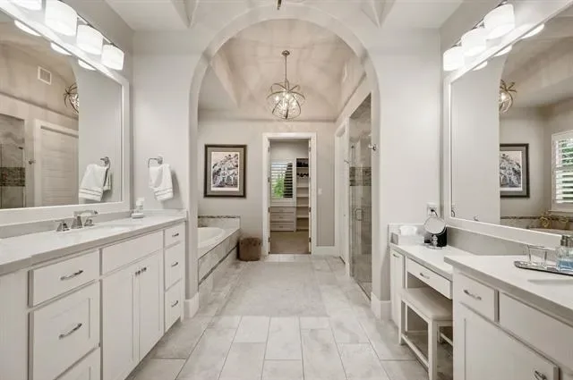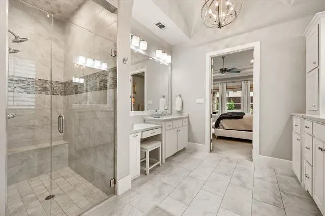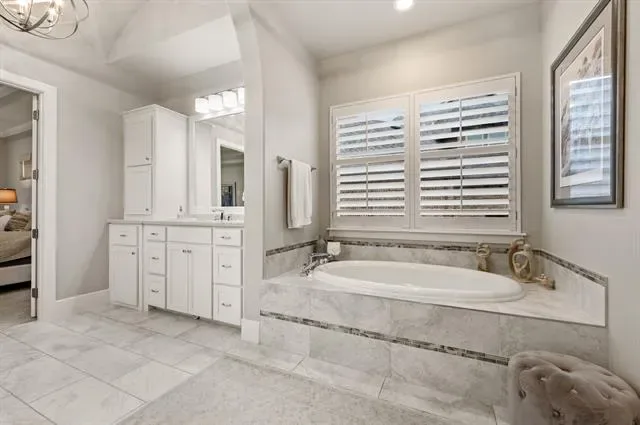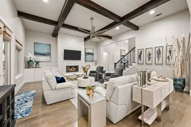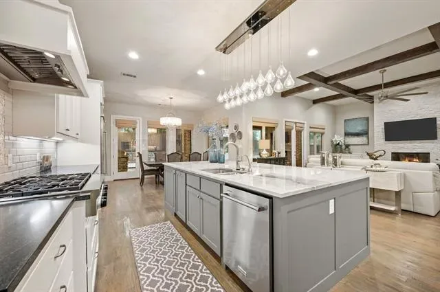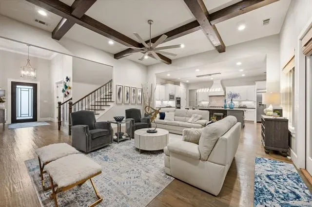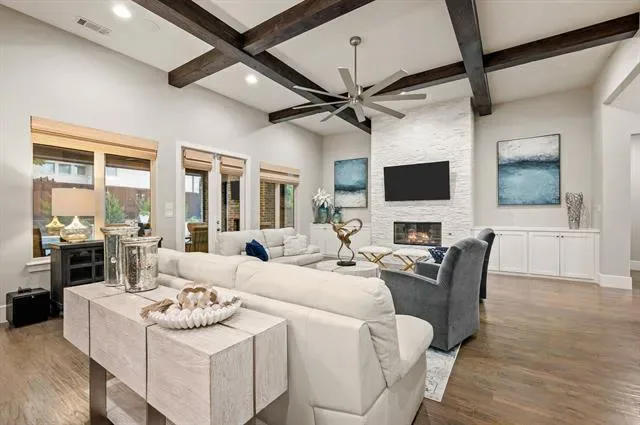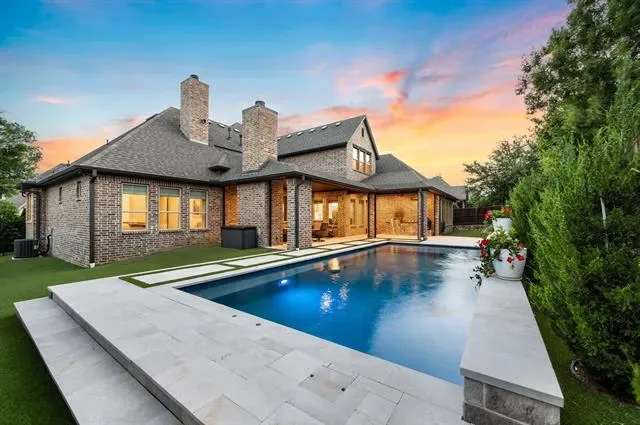 Welcome to this exceptional, MOVE-IN READY Monument Custom Home in the highly sought-after Lakes Addition, perfectly positioned in East Keller with quick access to Southlake Town Square, Sky Creek Ranch Golf Club &' nearby parks. From the moment you step inside, you’re greeted by soaring ceilings &' a beautifully designed private office featuring a built-in desk, decorative wood beams &' custom cabinetry– ideal for working from home in style. The versatile floorplan offers two bedrooms downstairs, including a perfect guest suite for extended stays or multigenerational living, along with a huge flex space currently used as a gym that can easily adapt to your needs. The spacious primary suite is a true retreat, showcasing elegant tray ceilings &' a spa-inspired bath with a soaking tub, dual vanities, separate glass shower &' an expansive walk-in closet with custom built-ins for ultimate organization. At the heart of the home, the chef’s kitchen impresses with custom lighting, a large island, gas cooktop, warming drawer, double ovens &' abundant cabinetry. The open-concept living room is highlighted by coffered ceilings and a cozy fireplace with both gas logs and wood-burning capability. Upstairs, you’ll find two additional bedrooms, each with private en-suite baths, along with a flexible bonus room ideal for a second office, media space or game room. Step outside to your private backyard oasis, complete with remote controlled screened-in patio, outdoor fireplace, built-in grill, top of the line low-maintenance turf and a dedicated gardening area! Completing the package is the gorgeous J. Caldwell custom pool with waterfall feature &' equipped with a heater and chiller, allowing temperature adjustments of ~15 degrees for year-round enjoyment. Additional upgrades include a Sonos speaker system, app-controlled smart features for security, sprinklers, HVAC, and pool equipment. EV charger in the garage and a brand new 2026 Trane HVAC system for primary. Truly this is a MUST SEE!