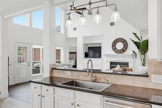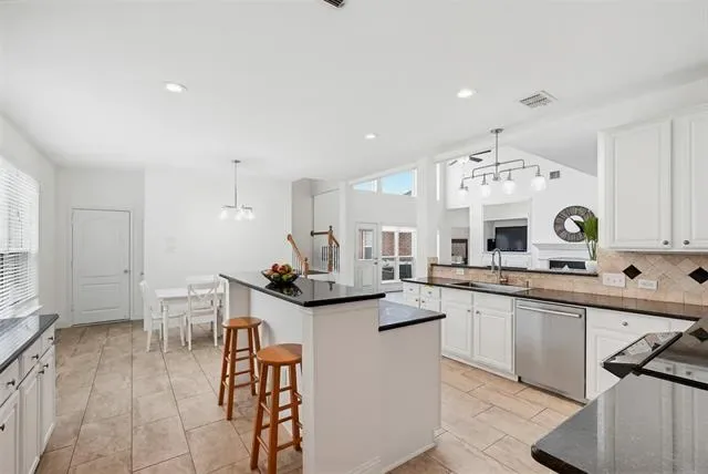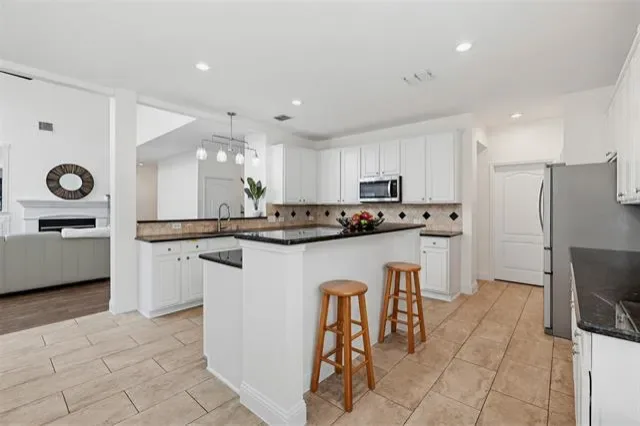 The kitchen is a true centerpiece, featuring abundant counter space, ample cabinetry, and a seamless connection to the family room, where a beautiful fireplace creates a warm and inviting atmosphere.