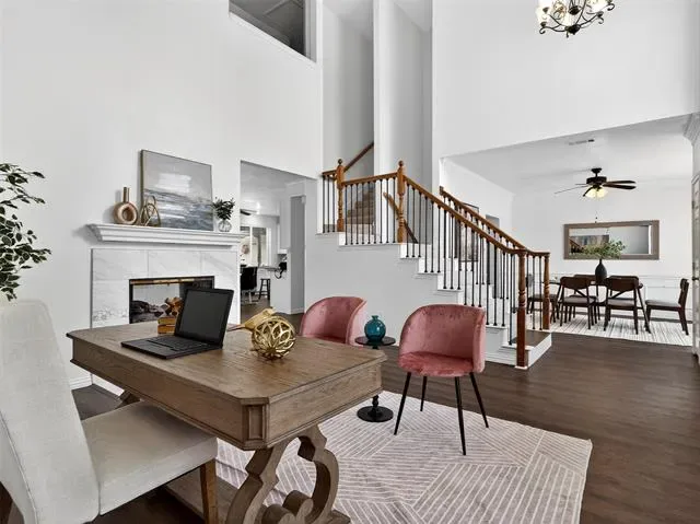 As you step inside, you’ll be greeted by an inviting entryway, tall ceilings, and abundant natural light. The flexible floor plan features two large living areas, a formal dining room, and an office on the main floor. The updated kitchen boasts granite countertops, stainless steel appliances, a center island, and ample cabinet space—ideal for the home chef.