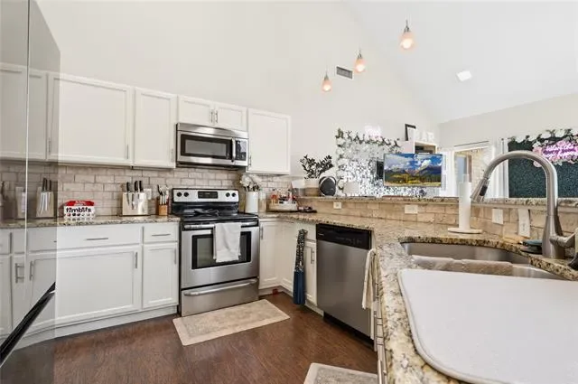 Charming 3 bedroom 2.5 bath 2 car garage home with fenced yard walking distance to Keller Library, KMS & KHS. This mature shade tree lot has a split level front entrance with steps up to the front door. As you enter, there is a landing leading down into a large living room with a cozy fireplace that is wood burning with a gas starter if you wanted that to be gas log instead, you can do that. The living features a wall of windows leading to a formal dining room. The kitchen features granite counters, a large breakfast bar, tumbled marble backsplash and ss appliance package. The kitchen is open to the breakfast nook and a smaller living space some used as a home office and some used as a bistro style area or sitting area. The hall has a pantry, half bath and 2 storage closets. The laundry area offers natural light with a window and also storage cabinets. The primary suite is downstairs with a modern bath with floating double vanity and large walk in shower and walk-in closet. Upstairs are 2 spacious secondary bedrooms and a jack-n-jill bath. Bedrooms, stairs & upper hall have carpet. The rest of the home is solid surface floors. The back patio off the kitchen and back of home is open; the back yard is large fenced grass yard with shade tree. The interior paint is 2 years old. Roof replaced in 2021. This can go cash, conv, FHA, VA. Can begin showing 4-1.