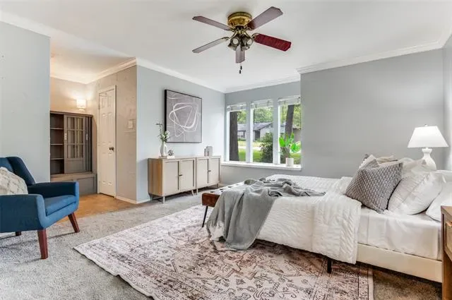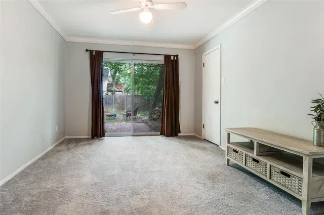 The primary bedroom offers a peaceful retreat, complete with split closets for added storage and organization, and serene views overlooking the front yard and courtyard. The secondary bedrooms are well-positioned for flexibility, including a middle bedroom with direct access to the bathroom—great for guests or a private suite-style setup. The rear bedroom offers a peaceful retreat with a sliding glass door that opens directly to the backyard, blending indoor and outdoor living. The spacious, tree-filled lot provides privacy and room to enjoy—plus no HOA restrictions.