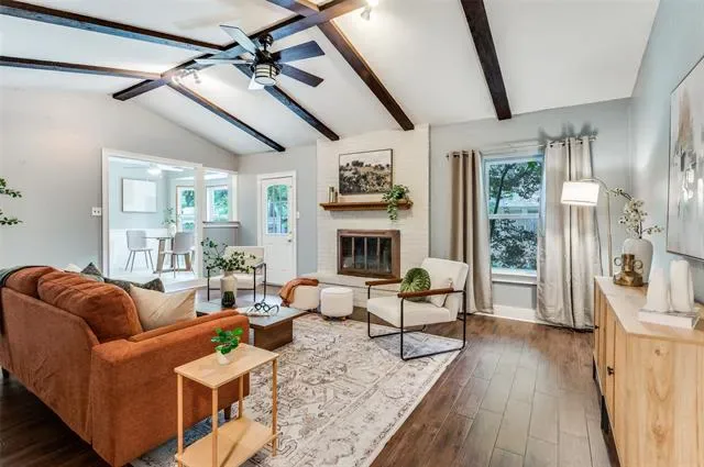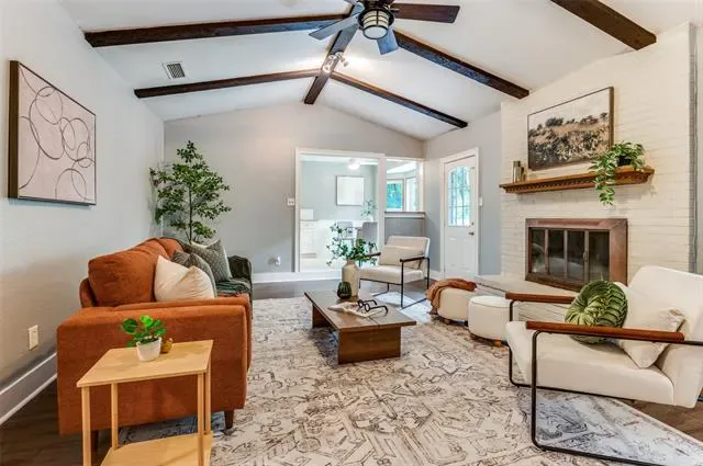 Inside, you’ll find a thoughtfully designed layout featuring 3 bedrooms, 2 bathrooms, and two comfortable living spaces. The main living room is the heart of the home, showcasing vaulted ceilings and a cozy fireplace that creates a warm, open atmosphere perfect for gathering.