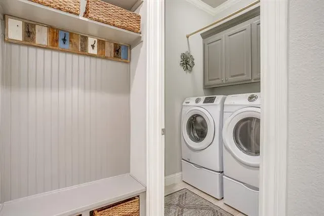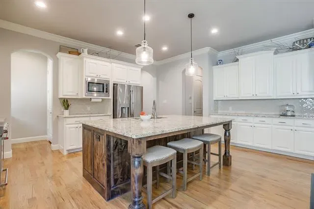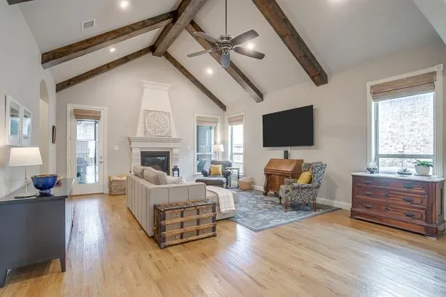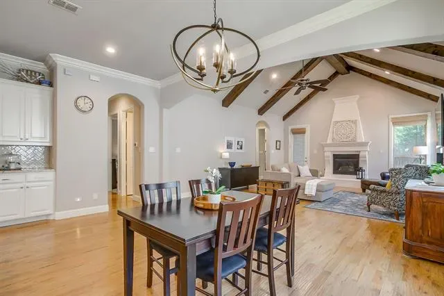 Tucked just minutes from the charm of Old Town Keller and the green space of Bear Creek Park, this beautiful 1-story, 2018 construction home offers the perfect blend of modern comfort and timeless style. Spanning 2,492SqFt, the thoughtfully designed floorplan features 3 spacious bedrooms, a separate study with a closet and French doors, and 2 and one-half bathrooms, all centered around an inviting open-concept living space ideal for both everyday living and entertaining. Inside, rich hardwood floors lead you through light-filled living areas highlighted by a soaring vaulted ceiling that creates an airy, elegant atmosphere. The kitchen showcases granite countertops with a large, breakfast bar island including stainless steel appliances and a gas range, butler’s pantry, built-in buffet and a walk-in pantry. The seamless flow between the living room, dining area, and kitchen makes the home feel both connected and comfortable. Every detail reflects quality craftsmanship and intentional design, offering a refined yet relaxed setting that feels instantly like home. The split primary retreat features a gorgeous coffered ceiling, bay windows, and a spa-like en-suite bathroom with separate soaking tub, luxury shower, double sinks + large closet. With its prime Keller location, modern construction, and exceptional quality, this home delivers the best of convenience, style, and livability!