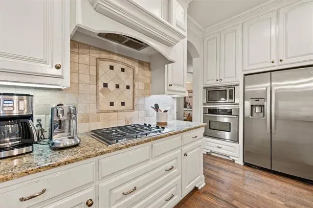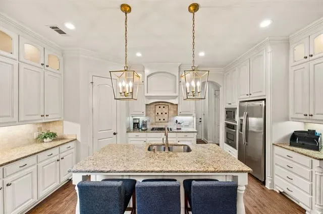 This gorgeous home is tucked inside the secure, gated community of Silver Lake! Offering a seamless blend of classic style and modern comfort with open-concept living, including three bedrooms, three full bathrooms, and a dedicated study with vaulted ceilings. Rich hand-scraped hardwood flooring, solid-core interior doors, and designer lighting create a warm yet elevated ambiance throughout. At the heart of the home, the gourmet kitchen showcases granite countertops, an oversized island, stainless steel appliances, and a generous walk-in pantry—seamlessly flowing into the inviting living area. Here, coffered ceilings and a striking natural stone gas fireplace serve as a stunning focal point. The serene primary suite is a true retreat, highlighted by a charming bay window and a spa-inspired ensuite bath complete with a jetted tub, walk-in shower, dual vanities, and a custom walk-in closet with built-in cabinetry. Upstairs, a spacious game room, private guest suite, and full bath provide exceptional flexibility for guests or multi-generational living. Step outside to the covered patio—an ideal setting for quiet evenings or effortless outdoor entertaining. Residents enjoy low-maintenance living with HOA-covered lawn care, along with access to a beautifully stocked fishing pond. Perfectly positioned in the heart of Keller, this home is just moments from premier shopping, dining, and recreation, including Bear Creek Park and The Keller Pointe, and is located within the highly acclaimed Keller Independent School District.
