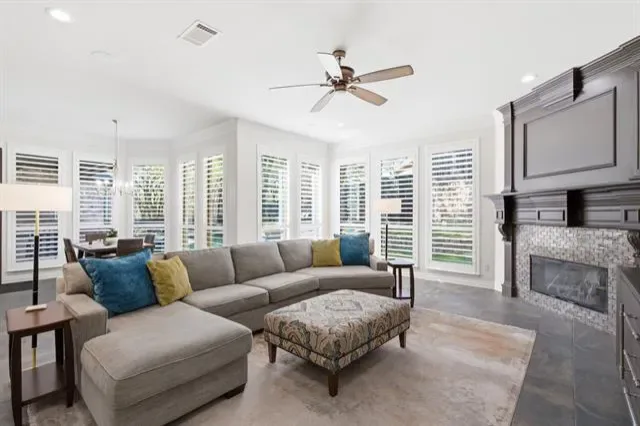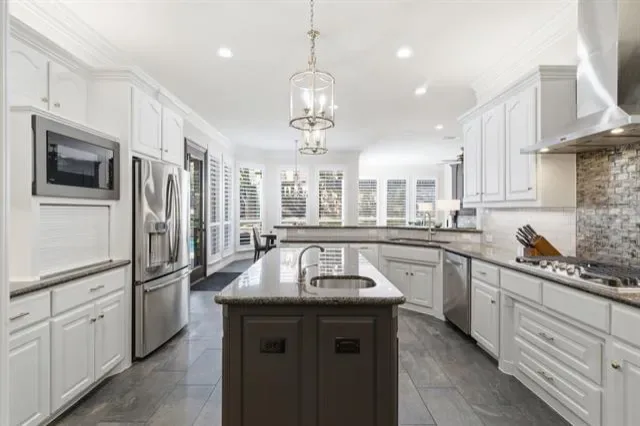 The heart of the home is the gourmet kitchen, featuring high-end appliances, custom cabinetry, and a generous island that makes cooking and gathering a joy. Flowing seamlessly into the living and dining areas, it creates an open and inviting setting that overlooks the backyard oasis.