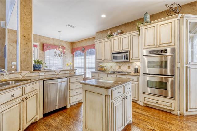 The gourmet kitchen is a true centerpiece, complete with granite countertops, stainless steel appliances, double ovens, and a gas cooktop – perfectly balancing style and functionality.