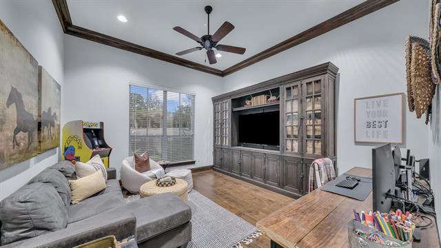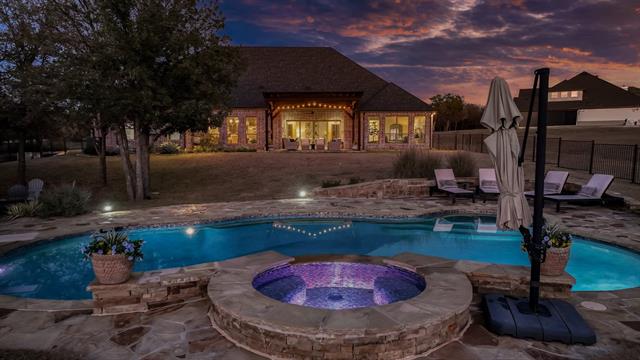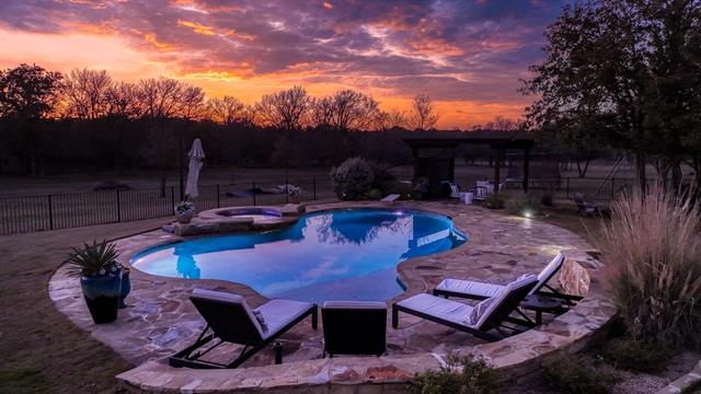 Welcome to Sugar Tree on the Brazos, one of the area’s most sought-after gated communities offering a unique ranch-style atmosphere along the scenic Brazos River and Sugar Tree Golf Course. Located just 20 minutes from Weatherford, this stunning property offers peaceful country living with convenient access to town. Built by renowned custom builder Chris Thomas, this 3,789 sq ft home sits on more than 3 secluded acres in a quiet cul-de-sac—an incredibly rare find in Sugar Tree. The natural setting is truly special, where deer roam freely and tranquil ponds dot the landscape. The home offers 4 spacious bedrooms, 3 baths, a private executive office, and expansive living and entertaining areas. The open-concept floor plan features a gourmet kitchen with top-of-the-line KitchenAid appliances, custom cabinetry, and generous space for gathering with family and guests. The luxury primary suite provides a spa-like experience with a beautifully appointed bath featuring heated floors, a jetted tub, and an oversized double-entry walk-through shower. Thoughtful upgrades throughout the home include spray foam insulation for high energy efficiency, a new Class 4 impact-resistant roof installed in 2024, a family safe room, and a Generac whole-home standby generator with automatic transfer switch. Car enthusiasts will appreciate the oversized 4-car garage, while the large decked attic with stairway access offers storage and potential for future finish-out. Step outside to your resort-style backyard retreat, complete with a heated pool and spa, pergolas, and motorized patio shades—perfect for entertaining guests or simply enjoying the beauty of the surrounding landscape. Golfers will appreciate living alongside Sugar Tree Golf Course, widely considered one of Texas’ finest public courses. Located in highly sought-after Brock ISD, this property combines luxury living with the charm of country life. Come enjoy brilliant Texas star-filled nights from your private country estate.