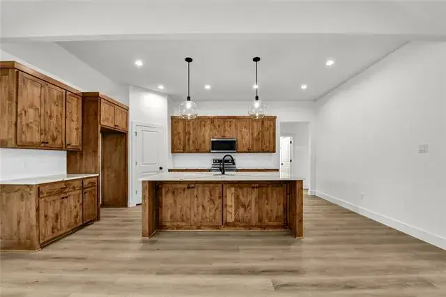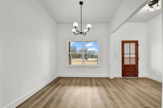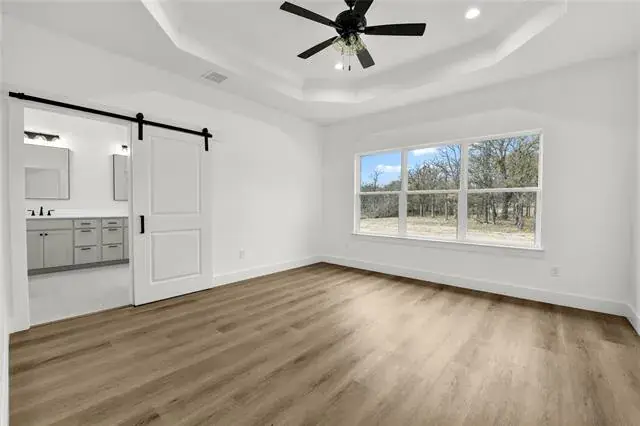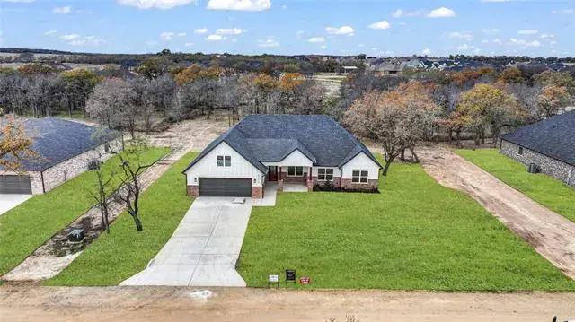 Builder offering interest rates as low as 5.125%—an incredible chance to lock in country luxury at a lower rate! Introducing a thoughtfully designed 2,037 square foot new build in Brock ISD’s premier Garner Ranch community—where exceptional craftsmanship and country charm come together on a scenic, tree-filled acre. The open-concept layout is anchored by a vaulted ceiling with striking box beams, creating a warm, inviting atmosphere that flows effortlessly through the main living areas. The kitchen is a true centerpiece, featuring a large island with quartz countertops, stainless steel appliances, and rich knotty alder shaker-style cabinetry throughout—bringing warmth, depth, and timeless appeal to the space. A walk-in pantry and generous storage make it as functional as it is beautiful. The spacious dining area faces the front of the home, filled with bright natural light, while the covered back porch overlooks a serene, wooded backyard—perfect for relaxing evenings and outdoor gatherings. This thoughtful floor plan includes luxury vinyl plank throughout, four generous bedrooms and two full bathrooms. The primary suite enjoys peaceful backyard views and features a stunning octagonal tray ceiling with a designer fan, creating an elegant retreat. The spa-inspired ensuite showcases an oversized shower with a luxurious soaking tub enclosed within, dual sinks with quartz counters, designer tilework, and a large walk-in closet. Landscaping will include a full sprinkler system, lush sod, and beautiful plantings around the front of the home to enhance its curb appeal. Additional highlights include a full laundry room and a 2-car garage with easy inside access. Estimated completion: December 2025 — ready to welcome its first proud owner. A showcase of design and detail, this new build delivers the ultimate in Brock-area living—set on a breathtaking, tree-filled acre that defines upscale rural charm.