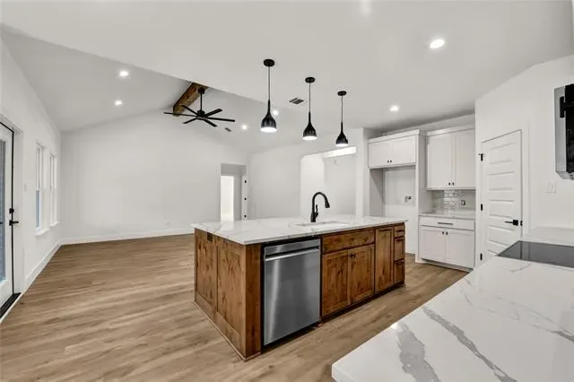 Builder offering interest rates as low as 5.125%—an incredible chance to lock in country luxury at a lower rate! Welcome to Garner Ranch in Brock ISD — where modern design meets country serenity. Set on a beautifully treed 1-acre lot, this brand-new 2,100 sq ft home offers the perfect blend of open-concept living and refined craftsmanship. Inside, soaring vaulted ceilings with striking box beams draw your eye upward, while the seamless flow between the living, dining, and kitchen spaces makes entertaining effortless. Enjoy Luxury Vinyl Plank floors throughout whole home with beautiful tile in bathrooms. The kitchen is a true showpiece, featuring a large island with quartz countertops, stainless steel appliances, and custom shaker-style cabinetry — with a rich stained knotty alder island and lowers complemented by beautifully painted uppers for contrast and warmth. A walk-in pantry and abundant storage complete the space. The spacious dining area overlooks the private backyard, where a covered patio provides the ideal spot for morning coffee or evening gatherings beneath the trees. The split-bedroom layout includes four large bedrooms, including a stunning primary suite with a tray ceiling accented by horizontal box beams and peaceful backyard views. The spa-inspired ensuite offers a soaking tub, dual sinks with quartz counters, elegant tilework, and a massive walk-in closet. Landscaping will include a full sprinkler system, lush sod, and thoughtfully selected plants to enhance the home’s welcoming curb appeal. Additional highlights include a large mudroom, full laundry room, powder bath, and a 2-car garage. Estimated completion: December 2025 — ready for its first proud owner to make it home. Crafted with care and character, this Garner Ranch gem captures the essence of upscale rural living—set on a stunning, tree-filled one-acre lot where quality construction meets everyday comfort.
