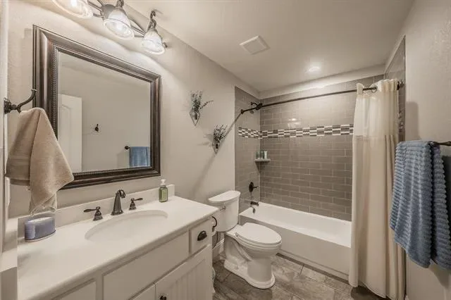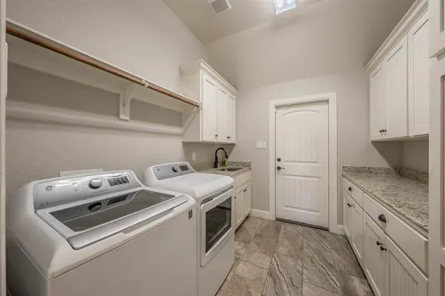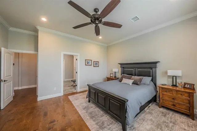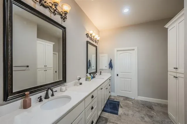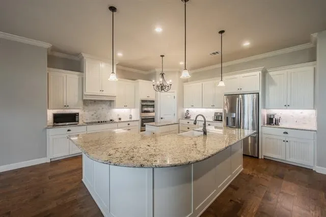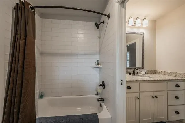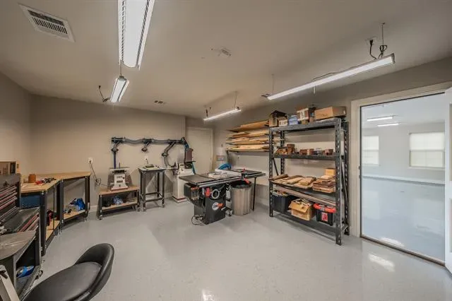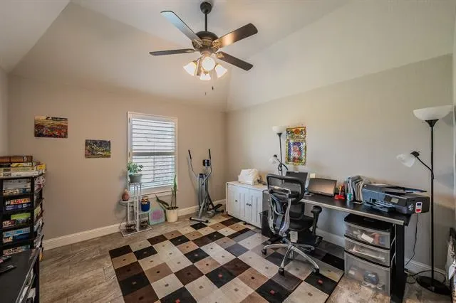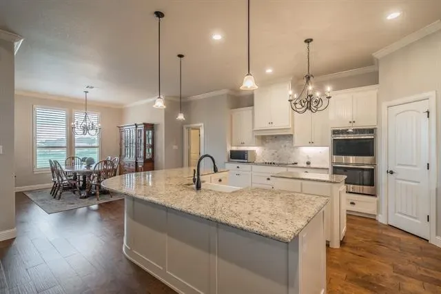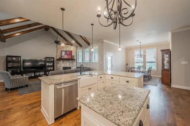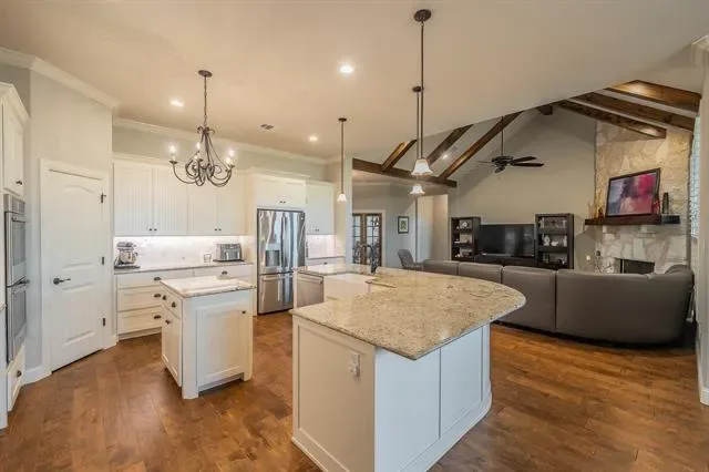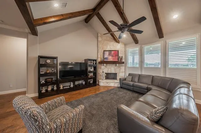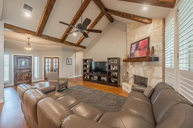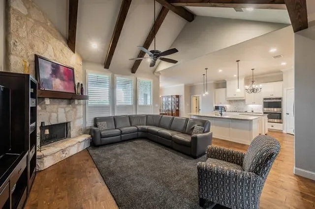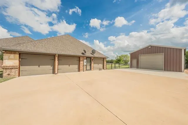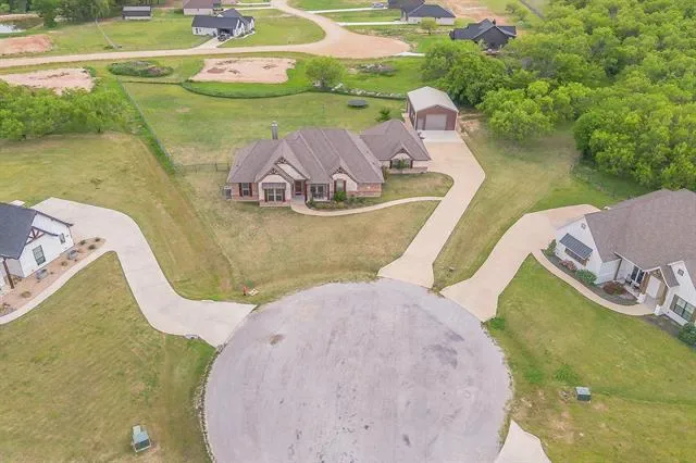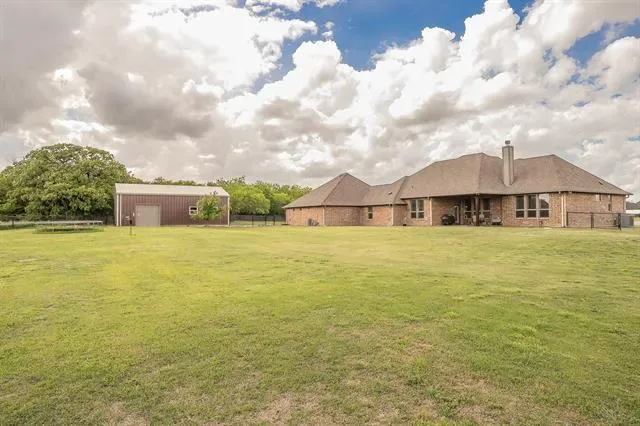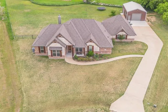 Striking curb appeal and timeless design set the tone for this beautifully crafted brick and stone home, accented with rich cedar details and ideally positioned at the end of a quiet cul-de-sac in highly sought-after Brock ISD. Spanning 2,805 square feet, the home features 5 bedrooms, 3 full bathrooms, and a dedicated office, thoughtfully designed for both functionality and comfort. Plantation shutters throughout add a refined touch, while the open-concept layout creates an effortless flow between the main living spaces. The kitchen is designed to impress and perform, featuring a large island with seating for everyday meals, a farm sink, double ovens, a prep island, and abundant cabinetry with added pull-out shelving. The living room is anchored by a wood-burning fireplace and highlighted by vaulted ceilings with exposed beams, creating warmth and architectural character. A pocket door separates the secondary bedrooms, offering added privacy and flexibility. The primary suite serves as a private retreat, complete with an ensuite bath, generous storage, and a spacious walk-in closet. Outdoors, the fully pipe-fenced backyard includes three gates and expanded irrigation coverage across the front, back, and side yards. The epoxied garage provides a clean, finished look, while the third bay has been converted into a climate-controlled workshop with both heat and AC.