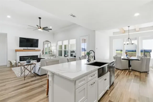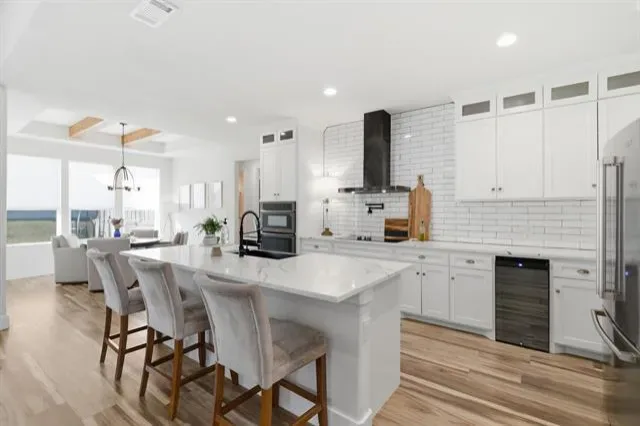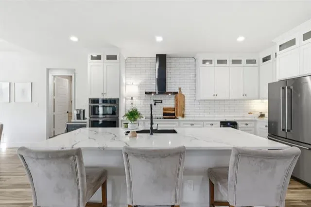 This home features a spacious open-concept floor plan ideal for entertaining and everyday living. The bright family room is filled with natural light and showcases a beautiful stacked-stone fireplace. The chef’s kitchen includes quartz countertops, a large island with bar seating, pot filler, wine fridge, and an oversized walk-in pantry.