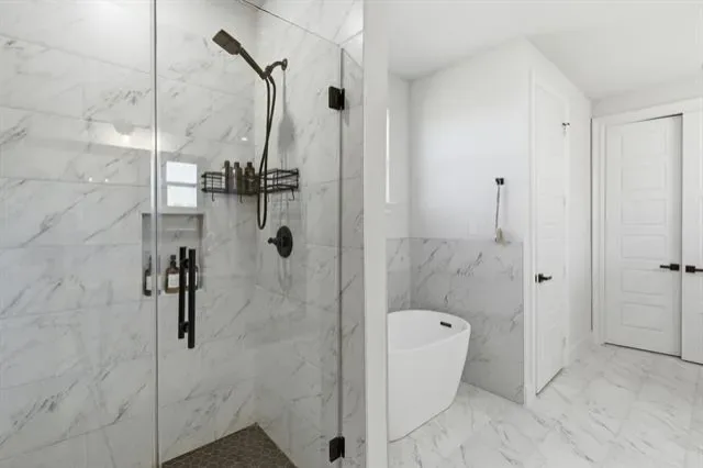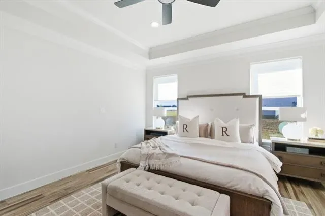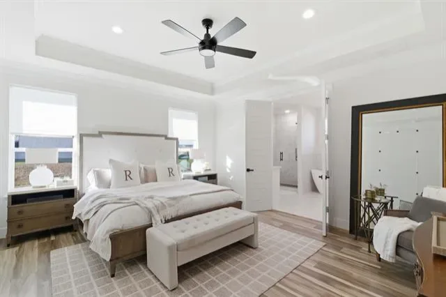 The split-bedroom layout provides privacy, with a spacious primary suite featuring a tray ceiling, soaking tub, dual vanities, and a large walk-in closet. Three additional bedrooms and a full bath offer plenty of space for family or guests, while a convenient half bath serves the main living areas.