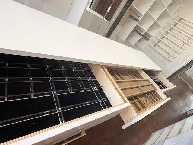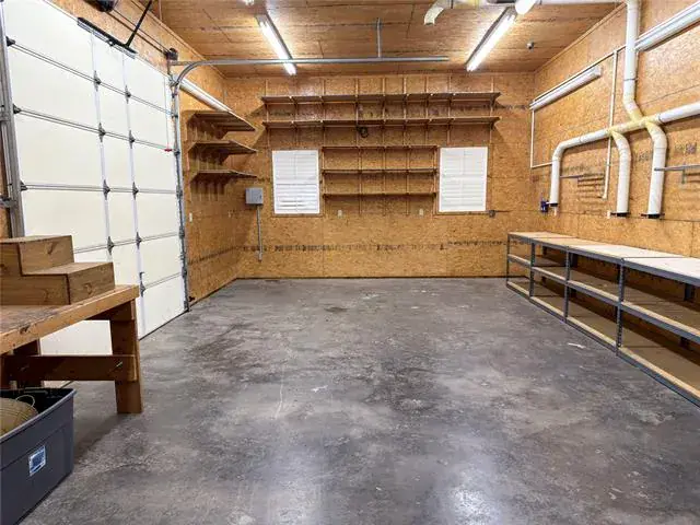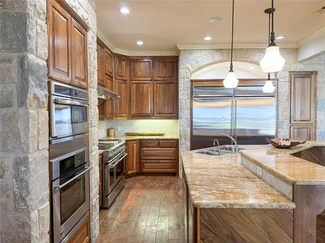 Inside, you’ll find an open floor plan with ten-foot-plus ceilings and a striking rock fireplace. Handcrafted walnut cabinetry and built-ins are featured throughout, while the chef’s kitchen is fully equipped with commercial-grade appliances for both casual and gourmet cooking. The split-bedroom layout includes three bedrooms, with a master suite offering a spacious walk-in closet, granite countertops, an oversized tub, separate walk-in shower, and a private sauna. A bonus exercise room can easily serve as a fourth bedroom, and one guest room includes a Murphy bed—ideal for a home office or multipurpose space.