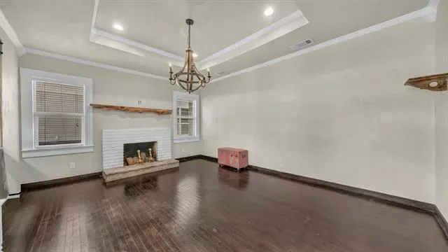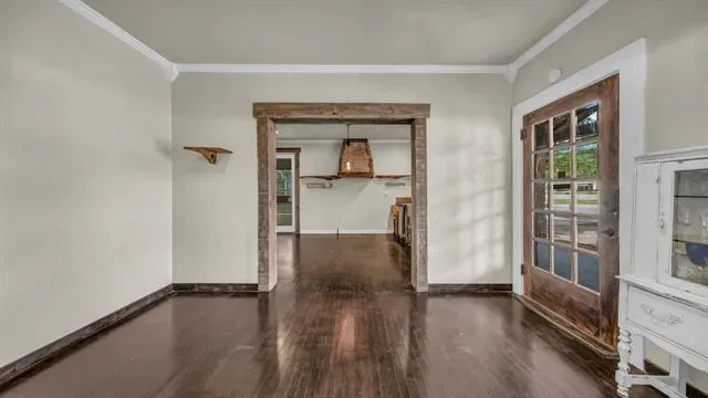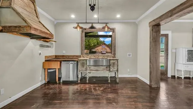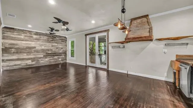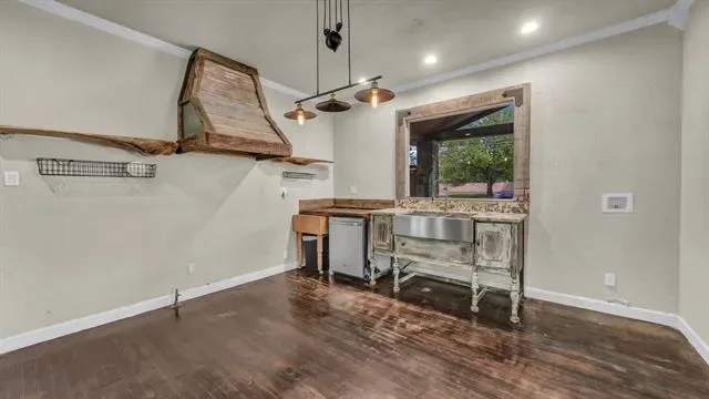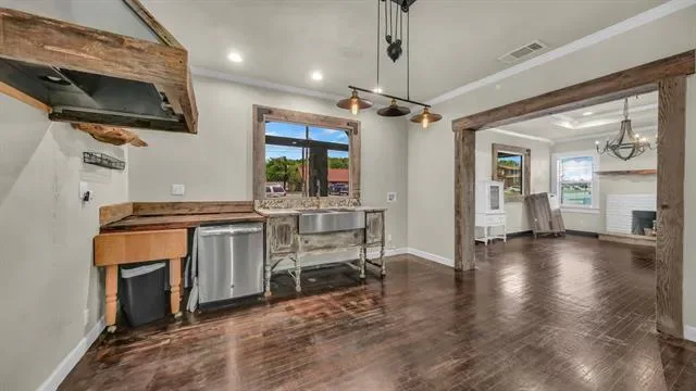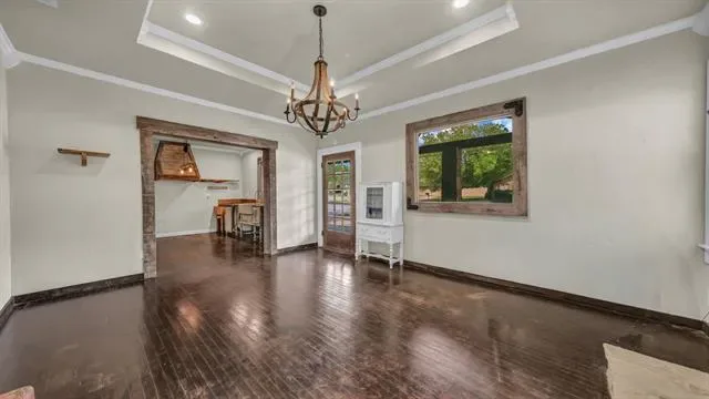 Inside, you’ll find original hardwood floors, raised ceilings, tall baseboards, and a wood-burning fireplace that highlight the home’s historic charm. The kitchen has been redesigned with removable features and floating shelves, creating a clean, adaptable space for commercial or residential use. All electrical, plumbing, and AC systems have been updated, and tray ceilings were added in the dining room.