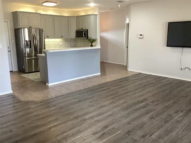 The open-concept kitchen flows seamlessly into the spacious living area, showcasing gleaming white Korean countertops, custom cabinetry with elegant above and below cabinet lighting, a built-in oven with convenient pot drawers, and a stylish gooseneck faucet with pull-down sprayer. Modern touches include a microwave, dishwasher, rocker light switches, and solid surface flooring throughout the entire home.