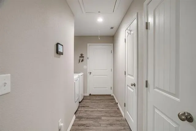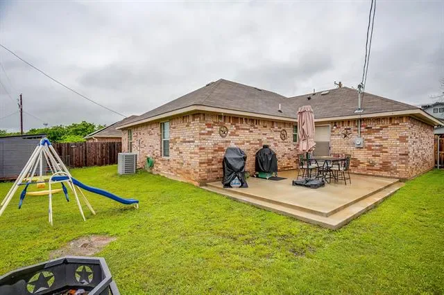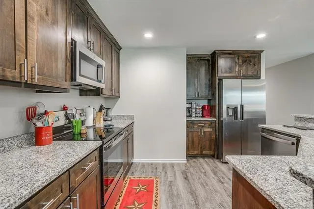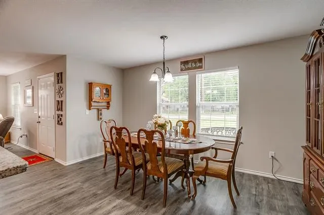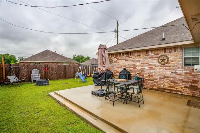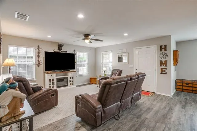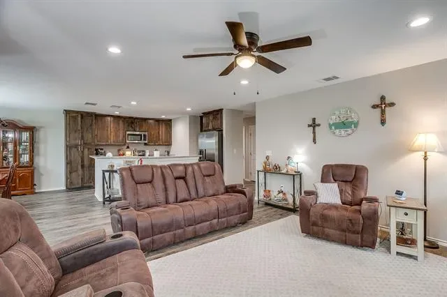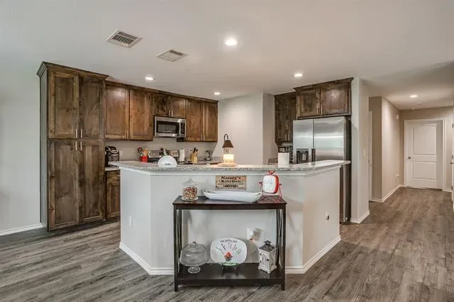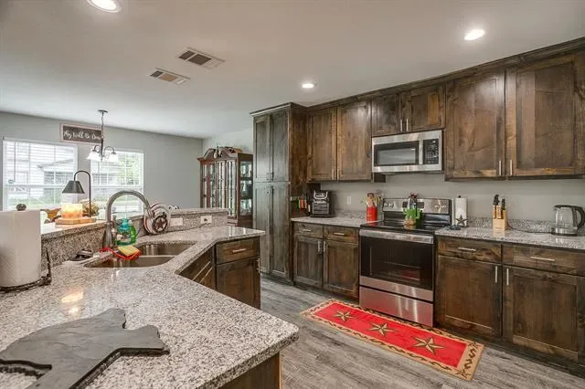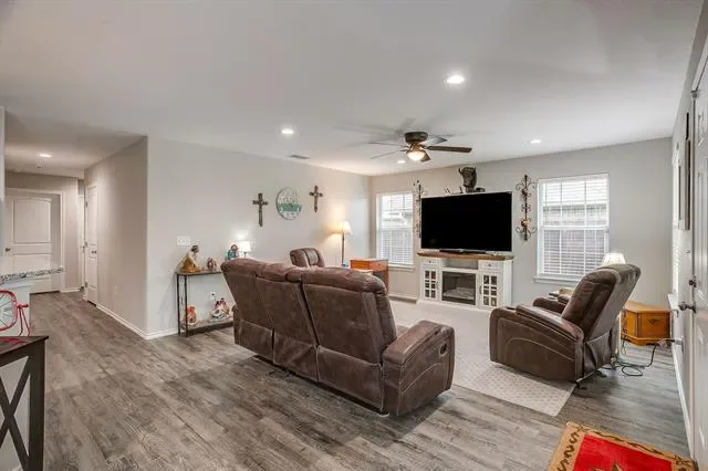 Open concept living with neutral grays creates a seamless transition between your living, kitchen, and dining areas. The kitchen island and all countertops throughout the home are made of granite. The sink and dishwasher are conveniently located at the island, which faces the living area, allowing you to work while watching TV, catching up with friends, or simply enjoying the interior of your new home. Recessed lighting in both the kitchen and living areas ensures ample illumination for cooking and entertainment. The entire home is electric, and the appliances are stainless steel. Additionally, there’s a water line for the refrigerator. The fenced yard is the perfect size for gatherings on the patio. Call your agent to see this beautiful &' affordable home!