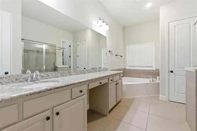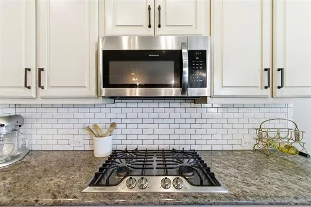 At the heart of the home, the kitchen is designed for gathering. A massive center island anchors the space, complemented by granite countertops, a gas cooktop, stainless steel appliances, gray cabinetry, a classic white subway tile backsplash, and a walk in pantry. It opens effortlessly to the family room, where a striking brick fireplace with a custom mantel creates a warm focal point overlooking the backyard.